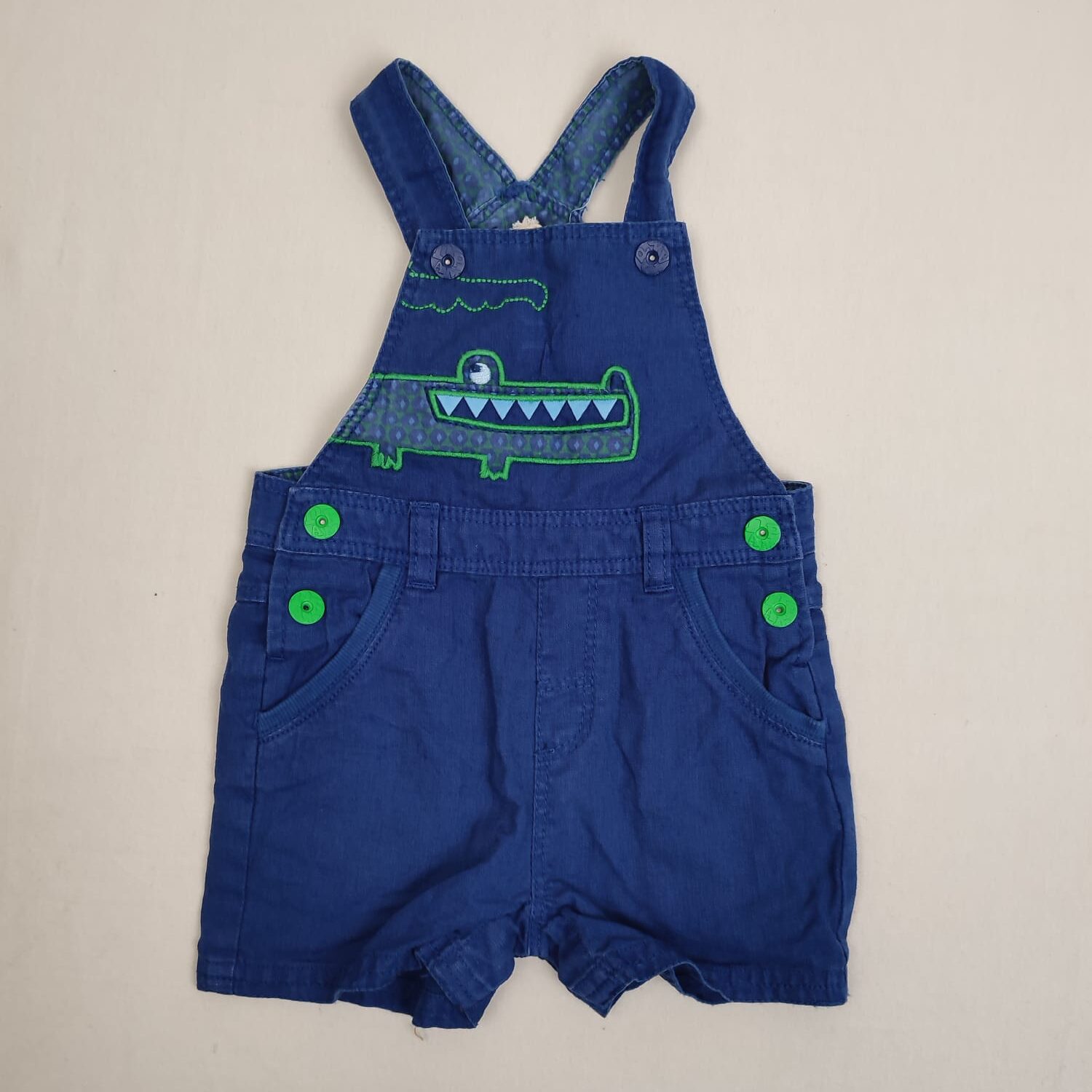 Autres commentaires : 49% polyester – Salopette courte bleu foncé, motif crocodile bleu et vert, hauteur des bretelles réglable par deux boutons pression, doublure 65% polyester et 35% coton au motif bulles bleues sur fond vert, fermetures latérales et à l’entrejambe par boutons pression