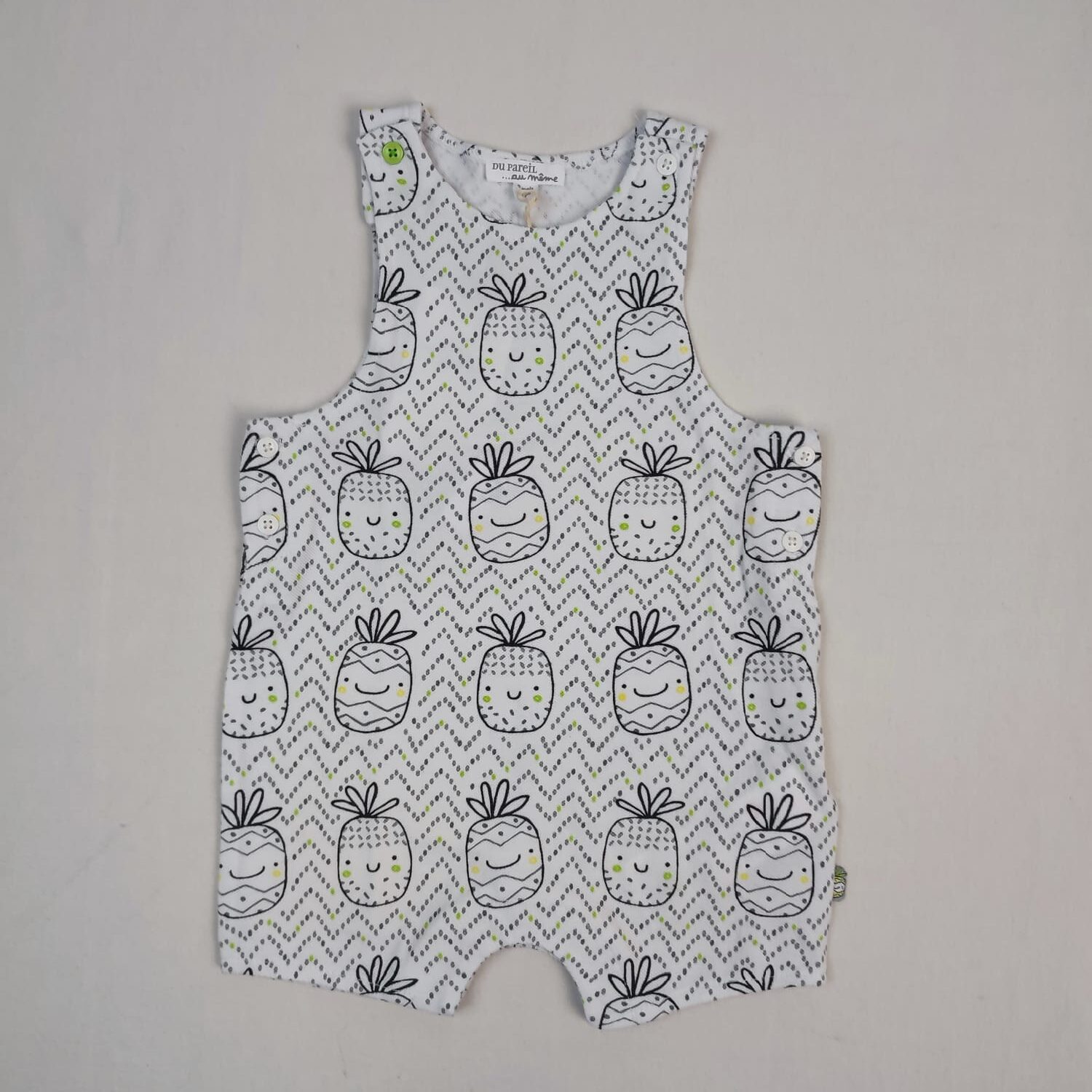 Autres commentaires : Salopette courte, motif ananas et chevrons gris, bretelles réglables par boutons, fermetures latérales par petits boutons et par boutons pression à l’entrejambe
