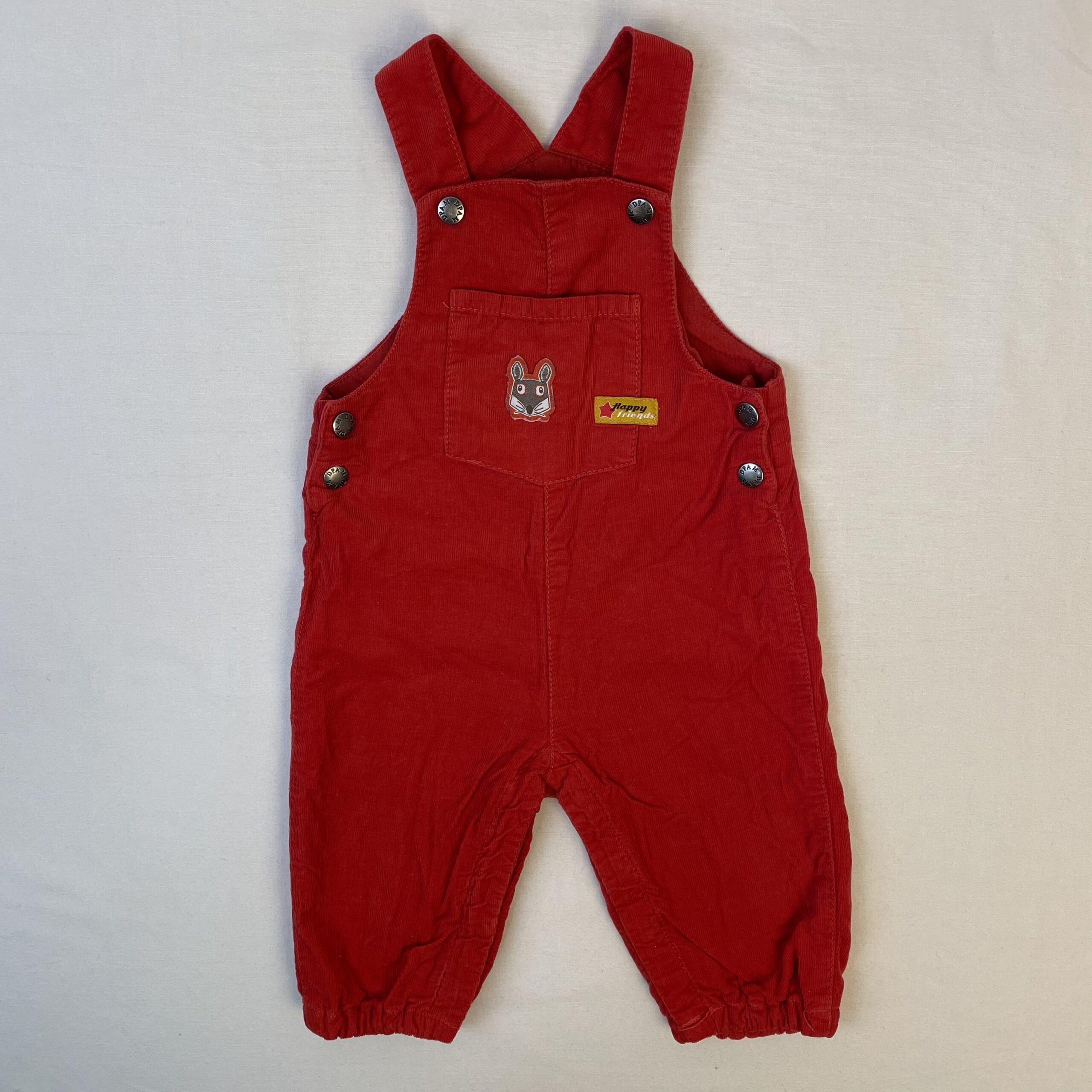 - Salopette rouge, hauteur de bretelles réglables par deux boutons pressions, fermetures latérales et à l’entrejambe par boutons pression.