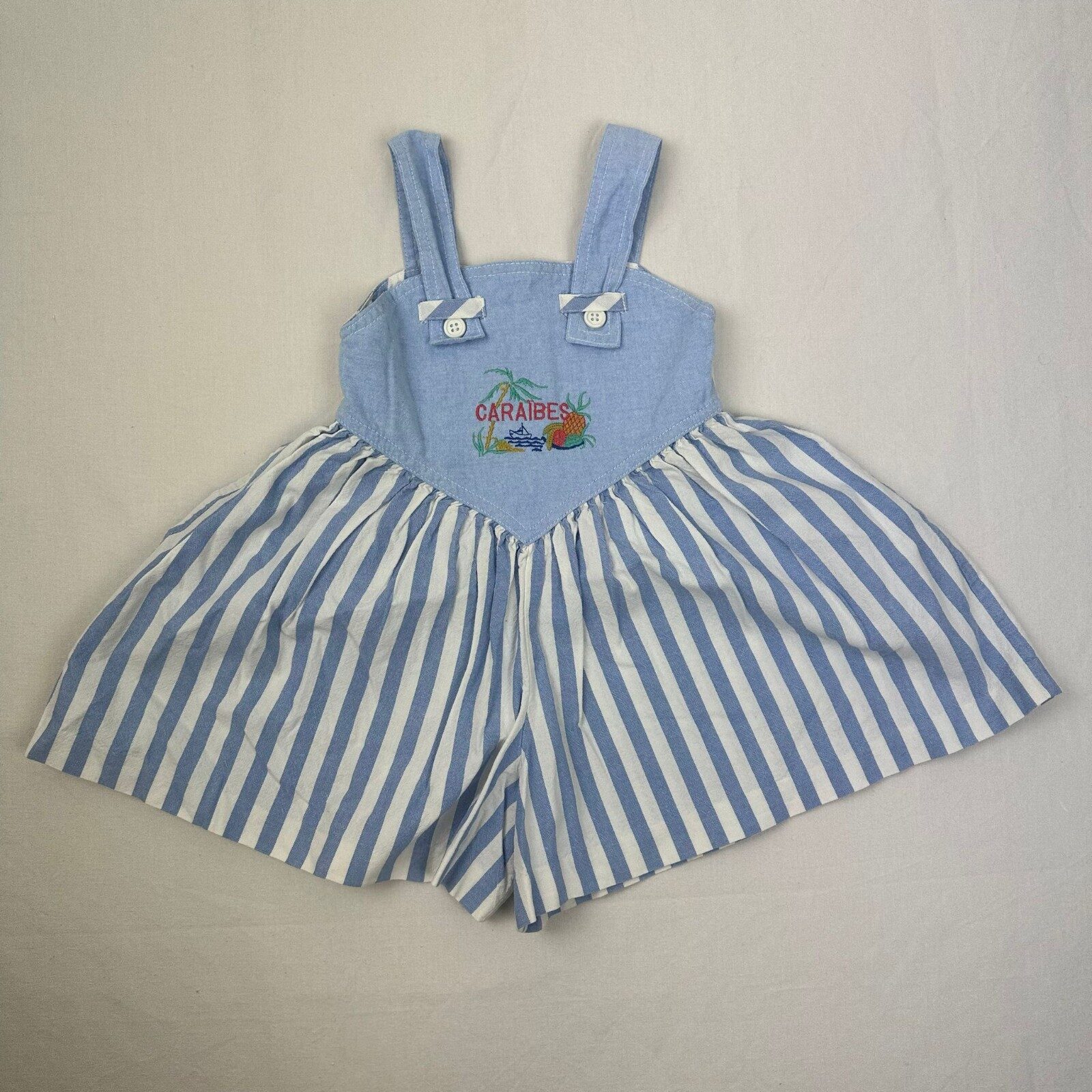 Autres commentaires : 20% polyester. Salopette large vintage à rayures bleues et blanches avec une fermeture au dos par boutons et motif « les caraibes ». Peit défaut: petite tâche orangée de 1mm dérrière à côté de la fermeture.
