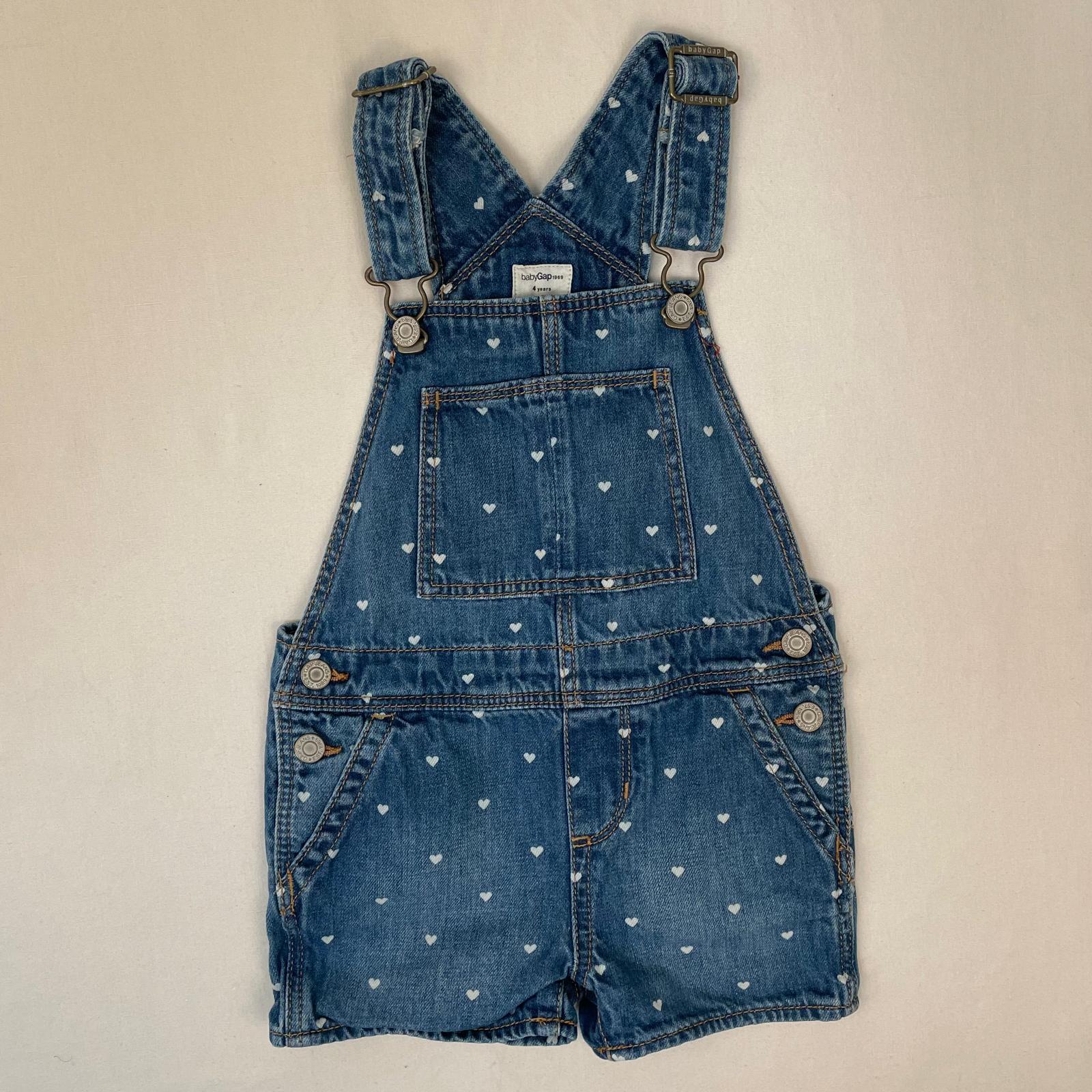 - Salopette courte en denim, fermeture par boucles salopette et boutons pression sur les côtés, parsemé de coeurs blancs.