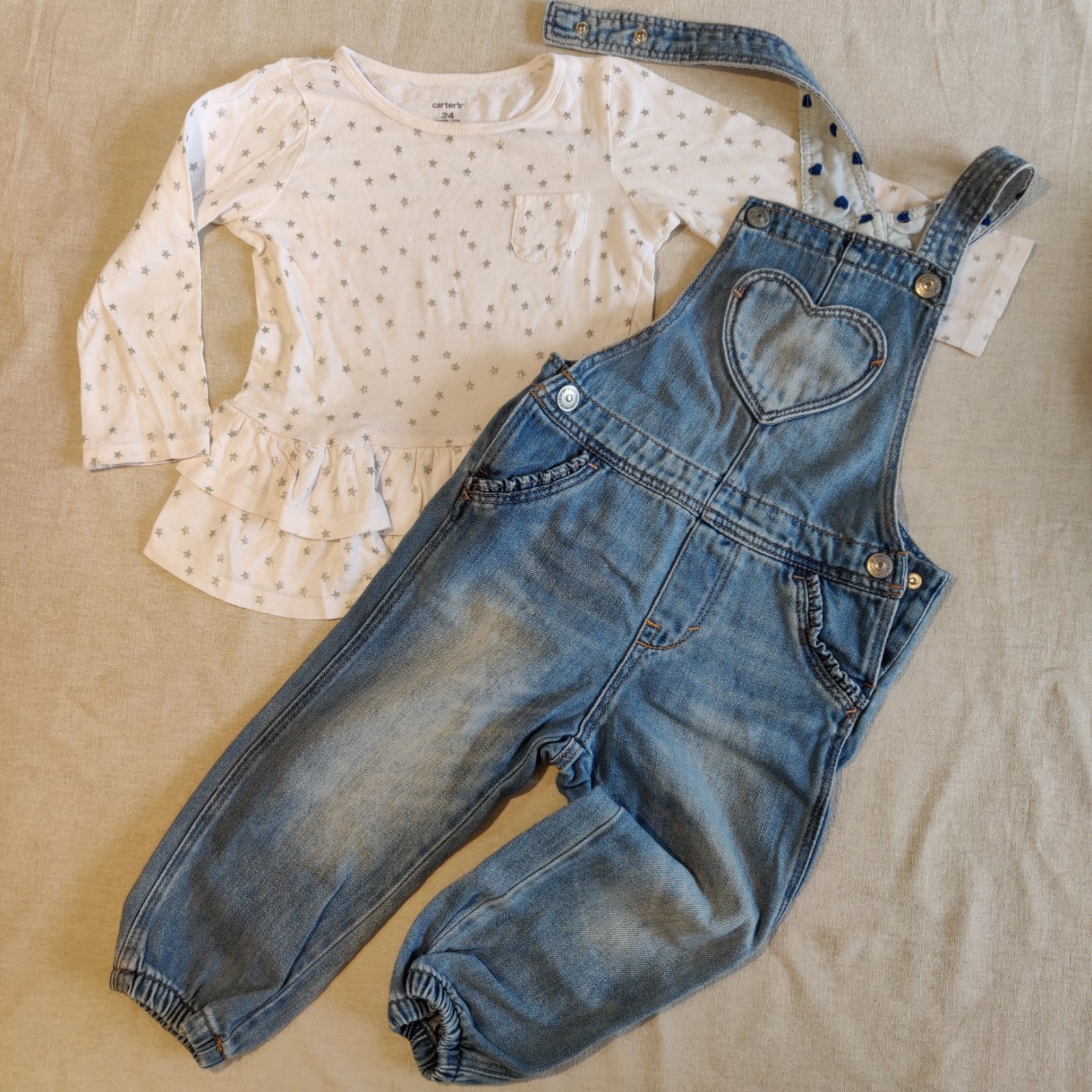 Autres commentaires : Salopette H&M jean denim clair, fermé par boutons pressions (2 niveaux) aux épaules et sur les côtés. Poche centrale en forme de coeur. Tunique blanche Carter’s manches longues, à étoiles et bas volanté. Non compatibilisée car pas impeccable au col.