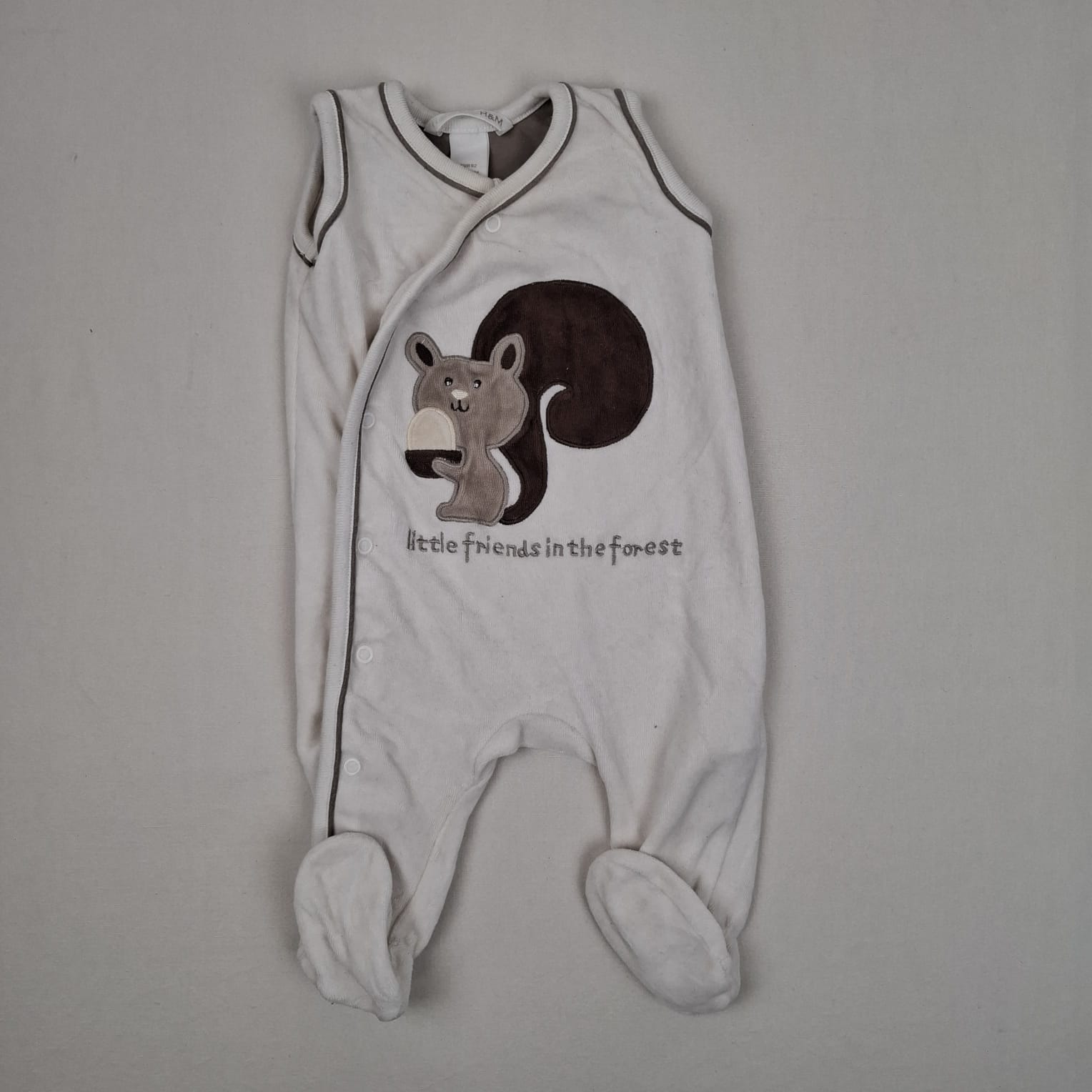 Autres commentaires : 20% polyester. Salopette en velours blanche, fermeture par boutons pression à l’avant droite, motif écureuil, inscription « Little friends in the forest ».