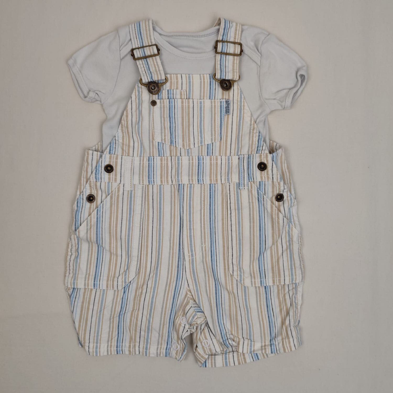 Autres commentaires : Salopette courte et blanche à rayures bleues et beige, bretelles à boucles réglable, fermeture latérales et à l’entrejambe par boutons pression. OFFERT : body blanc manches courtes Primark, motif petit éléphant bleu avec inscription devant « cute little guy ».