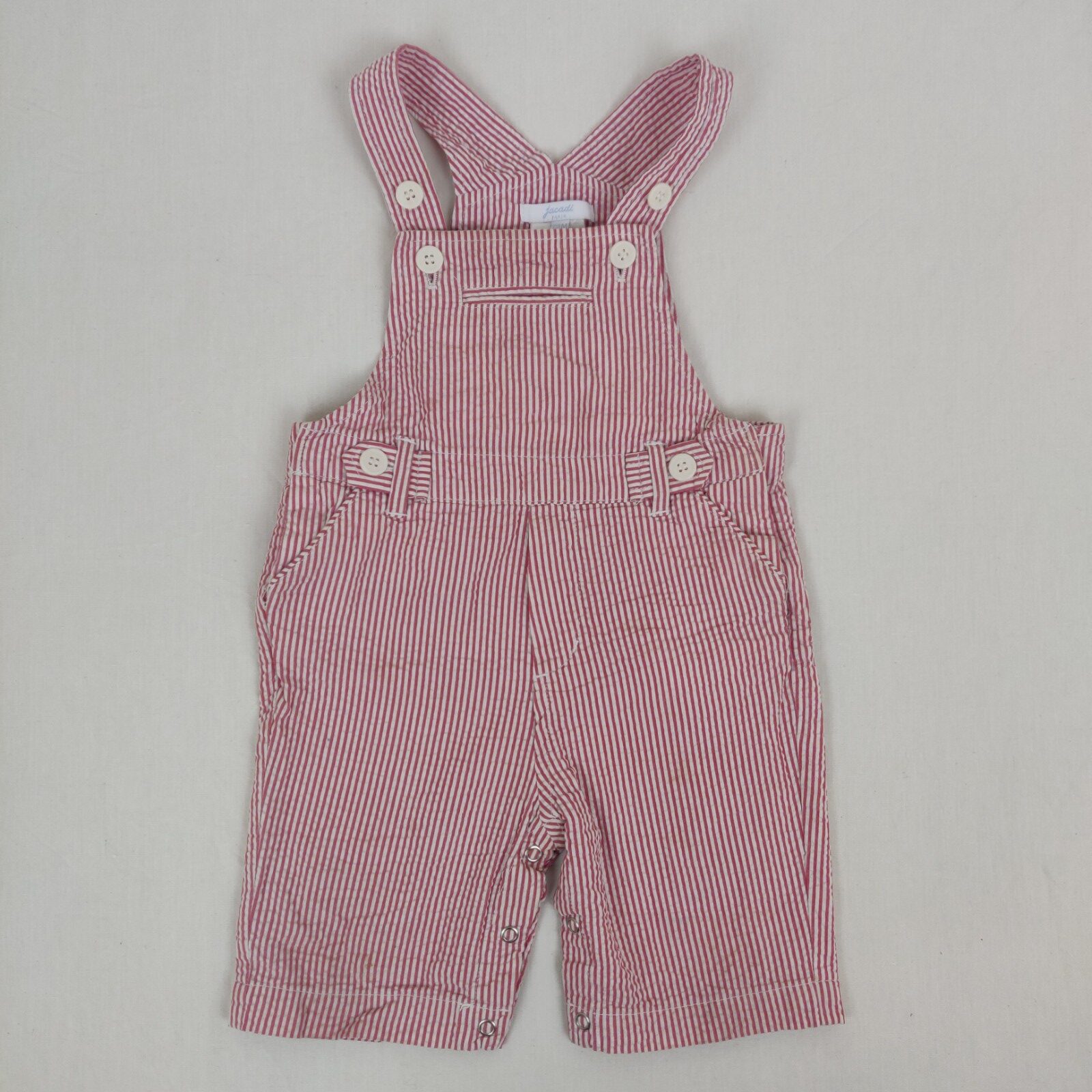 Autres commentaires : Salopette rouge avec rayures blanche sans manches et fermé par des boutons latérales et par des boutons pressions dans le bas.