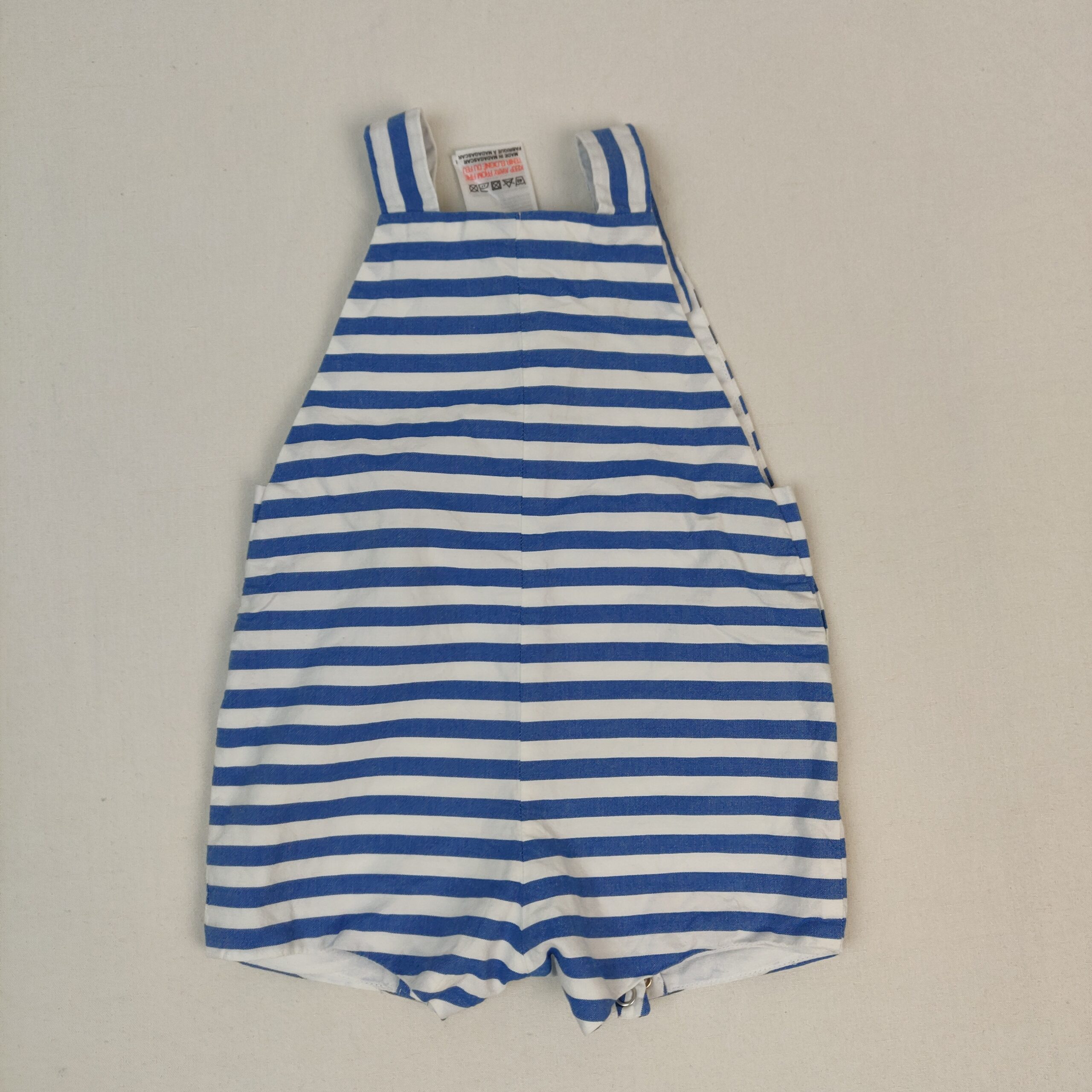 Autres commentaires : Salopette courte à rayures horizontales bleues et blanches, doublée en jersey de coton blanc, fermeture des bretelles par un bouton pression, fermetures latérales et à l’entrejambe par boutons pression.