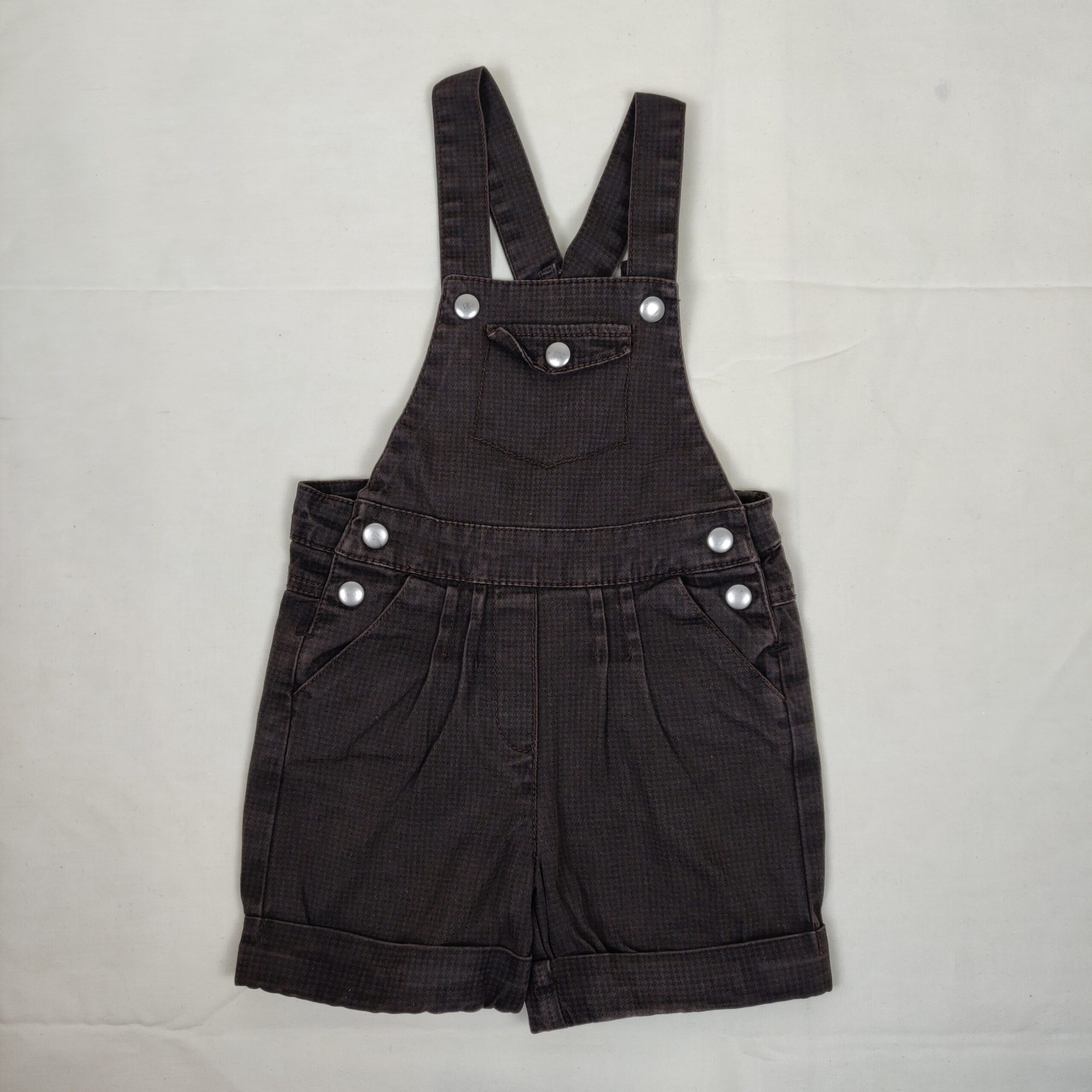 Autres commentaires : 2% élasthanne. Salopette marron nid de poule (rayures noires), fermée par 2 boutons pression de chaque côté, et boutons pressions aux épaules (deux niveaux de hauteur).