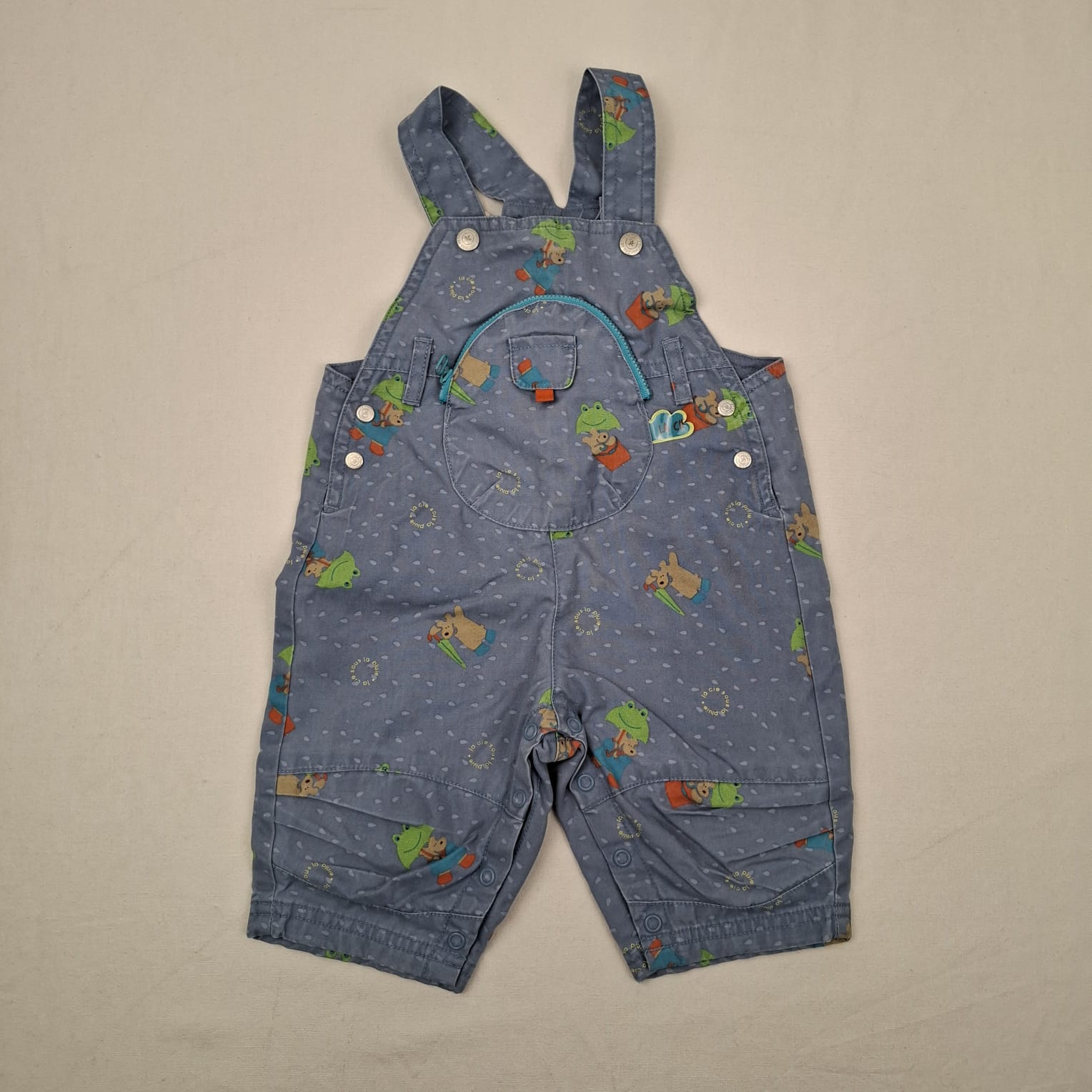 Autres commentaires : 35% coton. Salopette longue bleu gris, motifs ours, fermeture par boutons pression à l’entre jambes et latérales , hauteur des bretelles réglable à boucles réglables, poche plaquée centrale zippé, doublure en coton 100%.