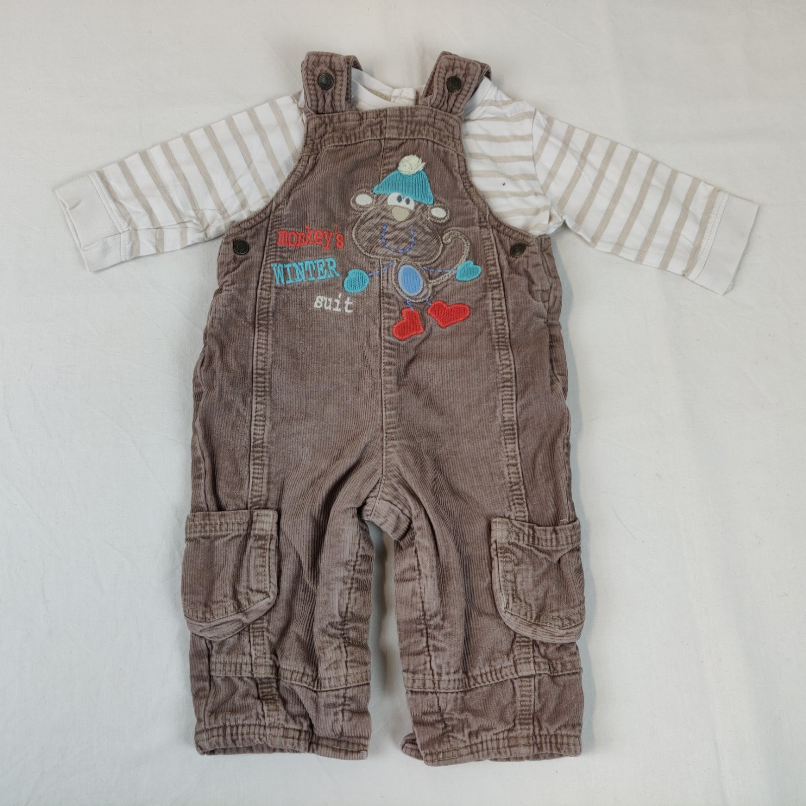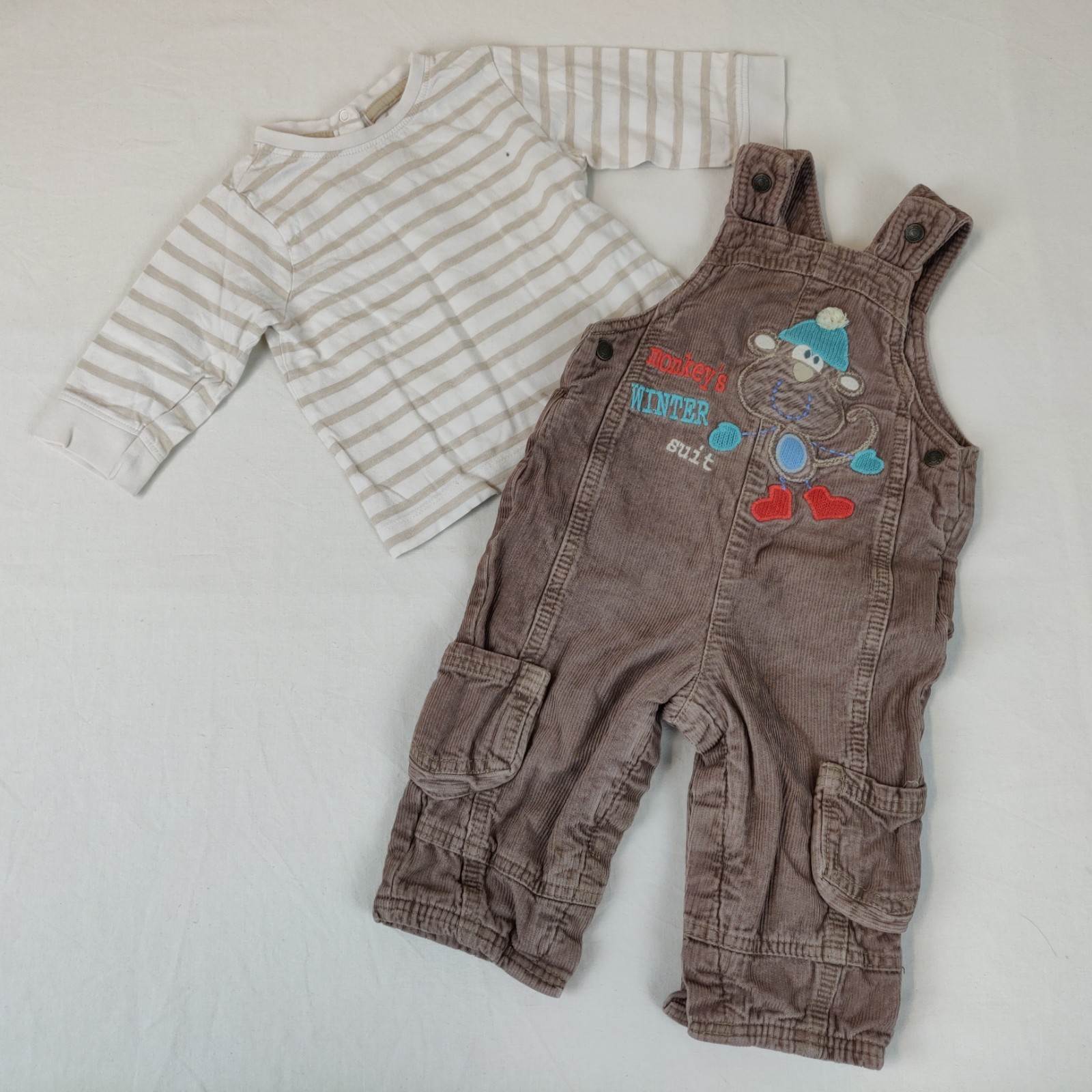 Autres commentaires : Salopette marron Marks&Spencer en velours côtelé 100%. T-shirt à manches longues blanc Kitchoun à rayures horizontales marron 100% coton avec fermeture à boutons pression au dos.
