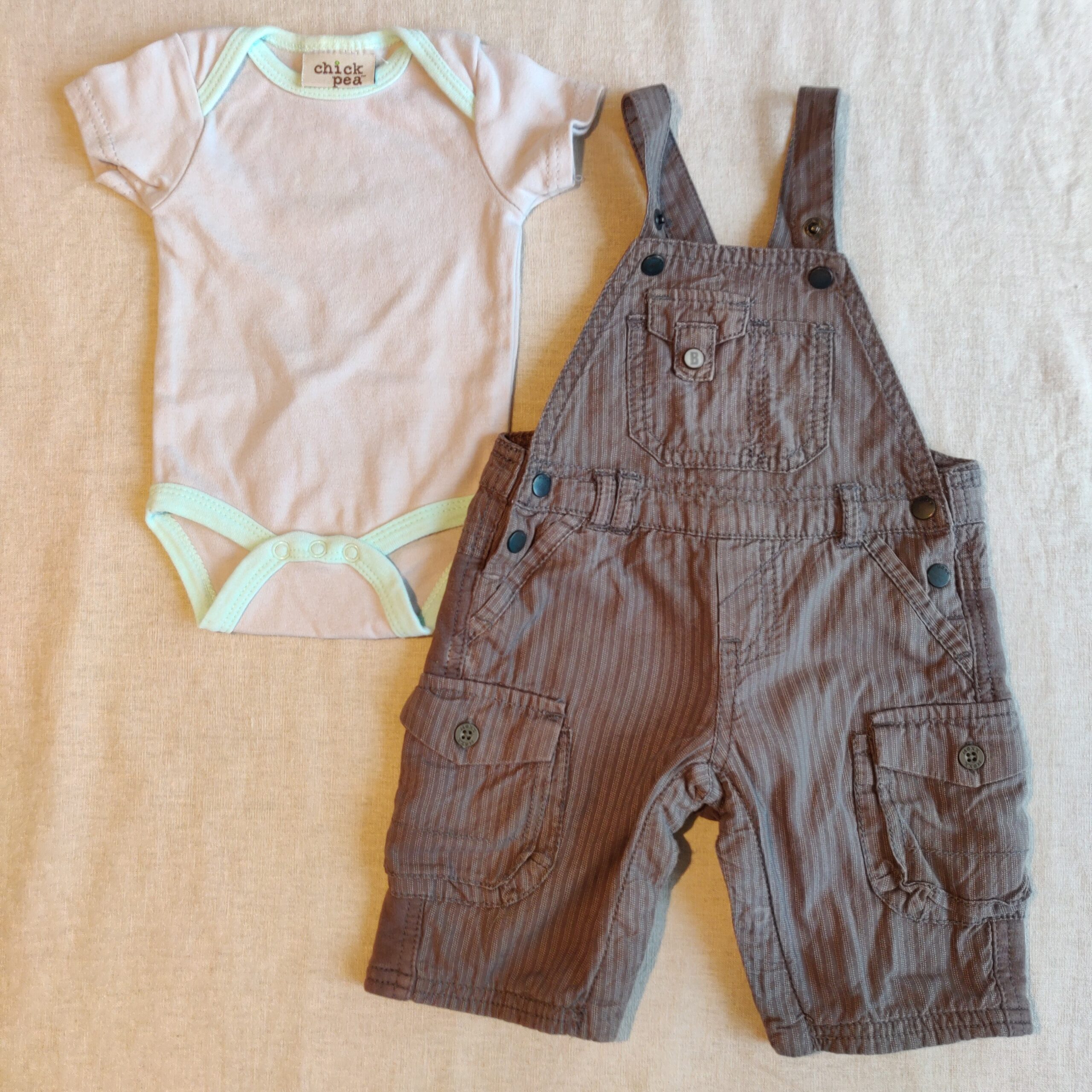 Autres commentaires : Salopette grise en coton tissé à fines rayures blanches, dos et doublure en jersey de coton gris, ouverture sur les côté, à l’entrejambe et aux bretelles (2 niveaux) par boutons pression. Vient avec un body manches courtes gris et liserés vert d’eau, offert.