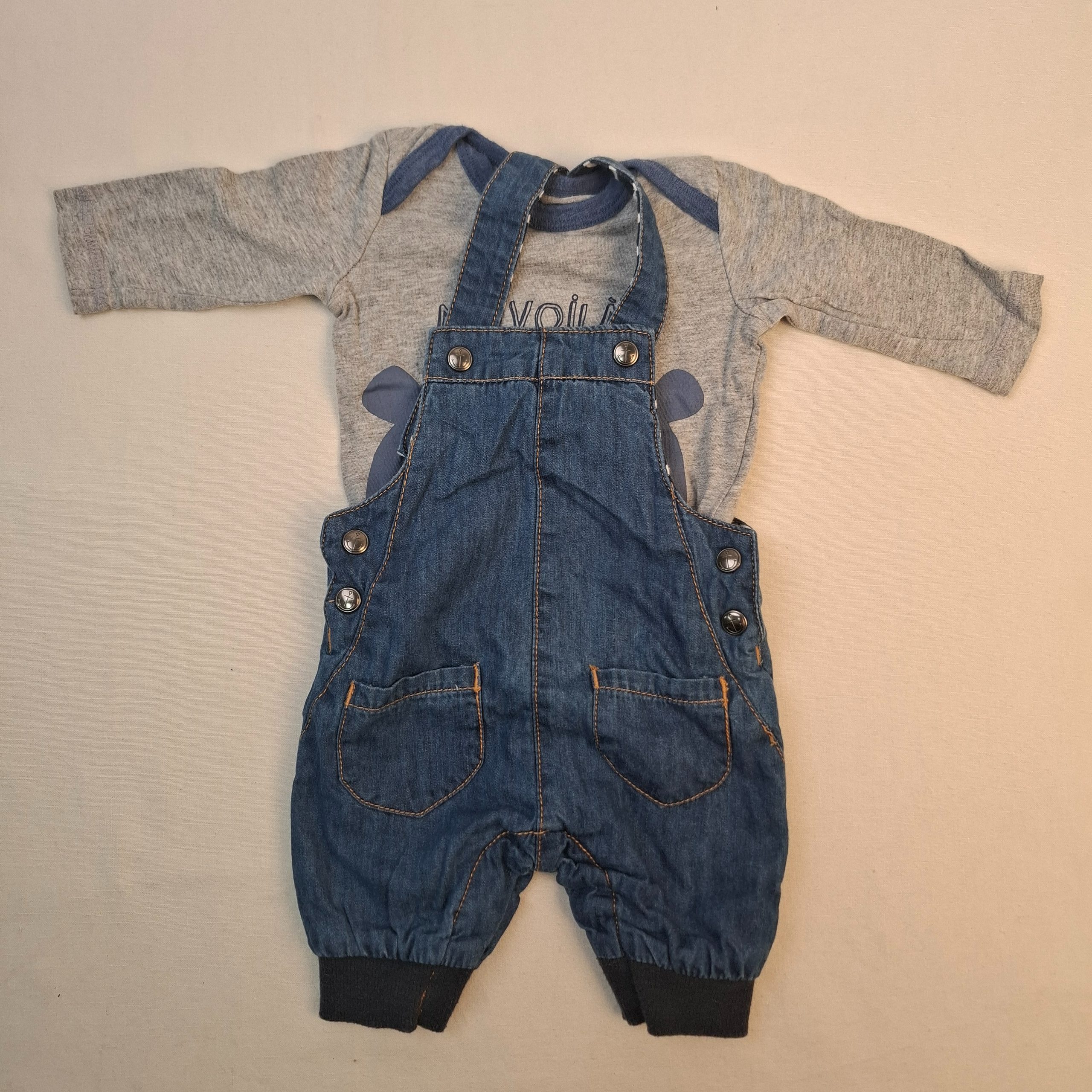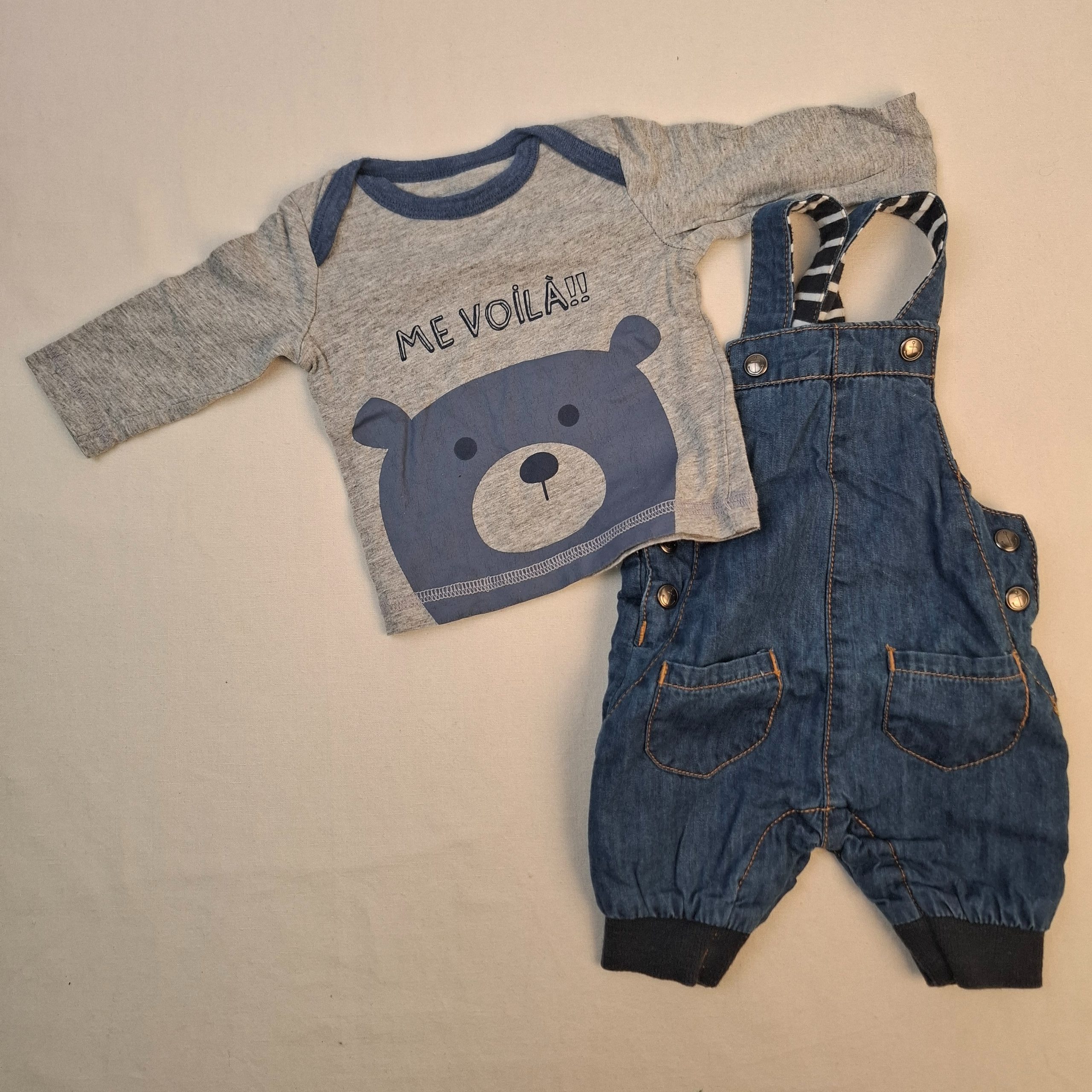 - Ensemble d’une salopette en jean et d’un t-shirt à manches longues.