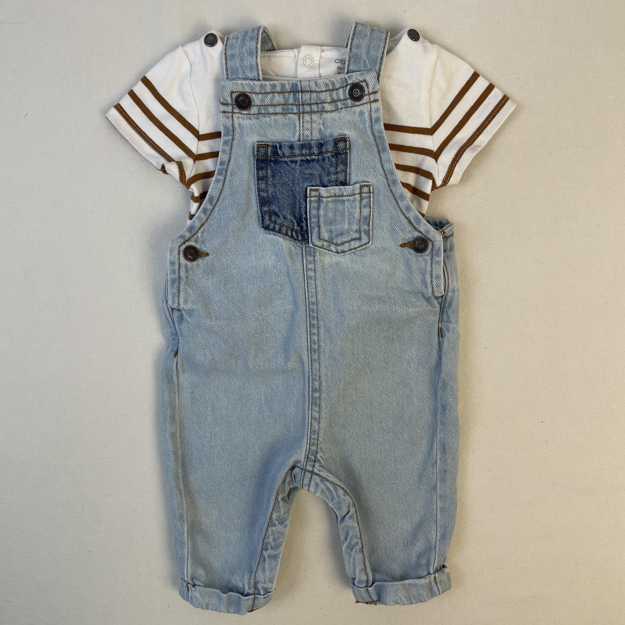 - Salopette en jeans bleu clair, hauteur des bretelles réglables par boutons pression, fermetures latérales et à l’entrejambe par boutons pression.