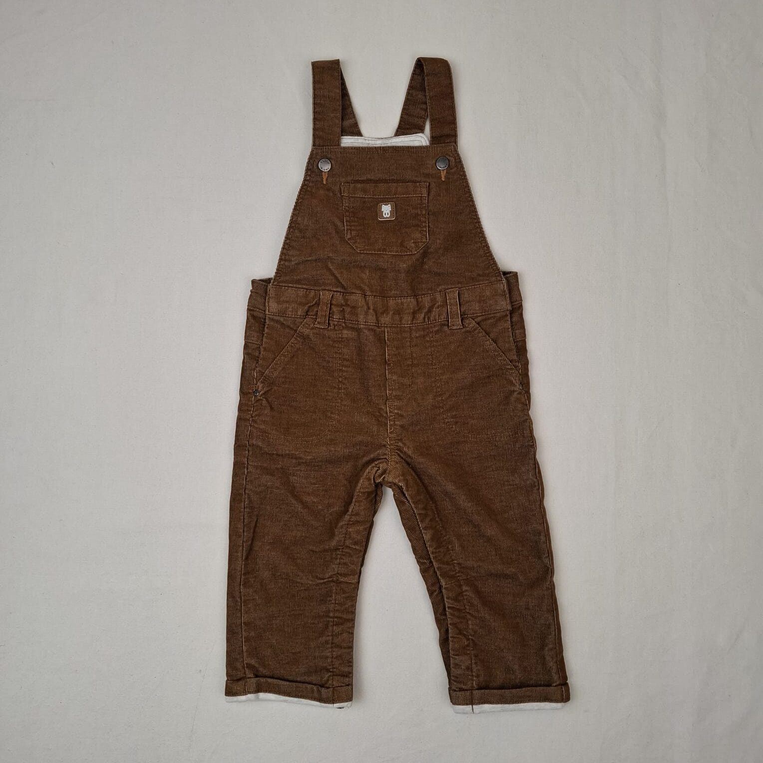 Autres commentaires : 28% polyester, 2% élasthanne. Salopette longue en velours côtelé marron, hauteur des bretelles réglable par deux boutons, fermetures latérales et à l’entrejambe par boutons pression, doublure en 100% coton .