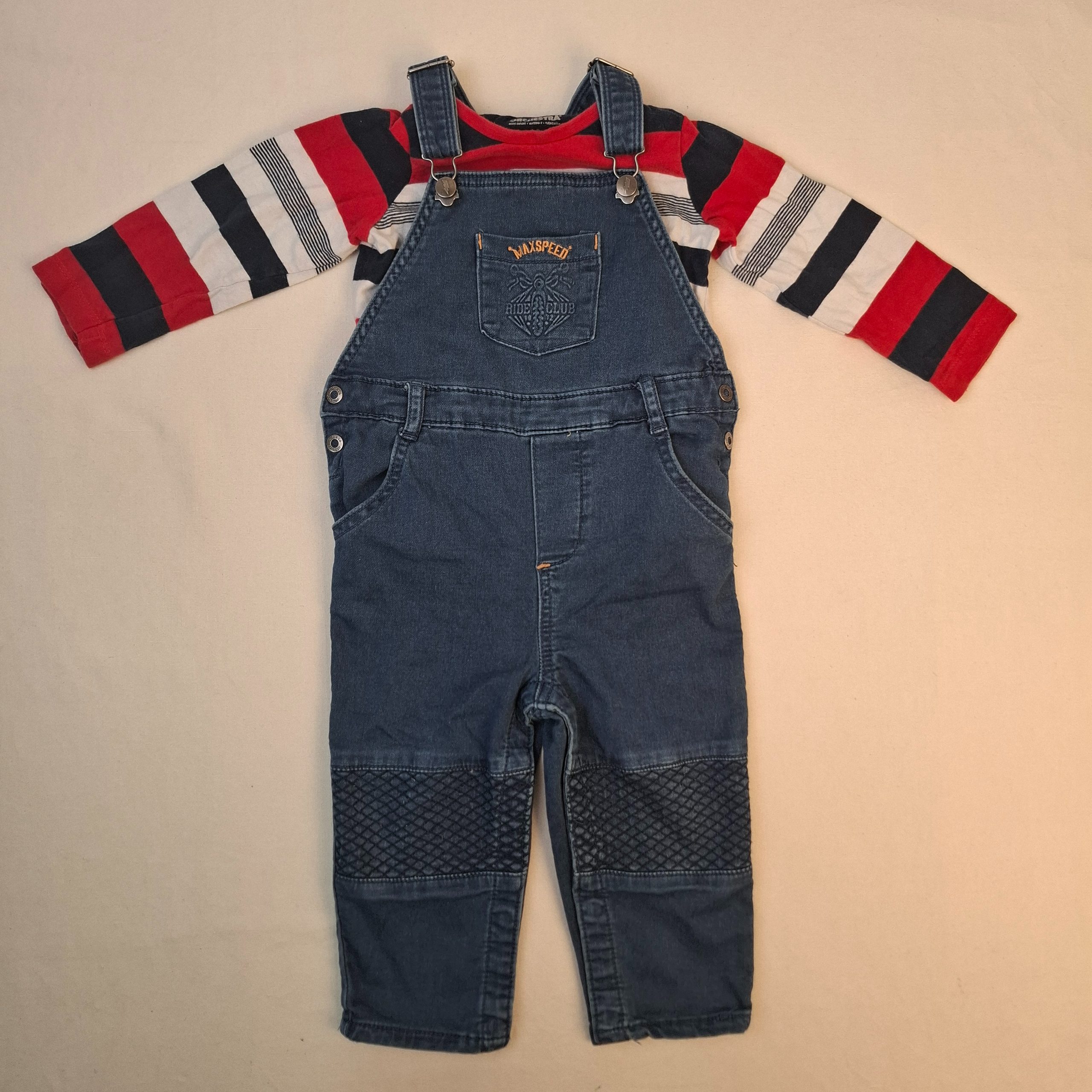 - Ensemble 2 pièces d’une salopette en jean et d’un t-shirt à mances longue.