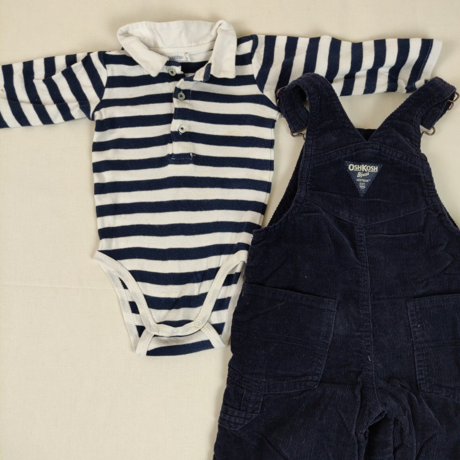 Autres commentaires : Salopette doublée à bretelles en velours cotelé bleu marine (12 mois qui taille grand). Griffe de la marque centrale cousue. Atttache des bretelles réglables à un bouton crochet. Ouvertures latérales à un bouton. 1 pochette centrale, 2 poches latérales et 2 poches arrières. 1 body Bout’chou à manches longues tâché blanc rayé bleu marine offert.