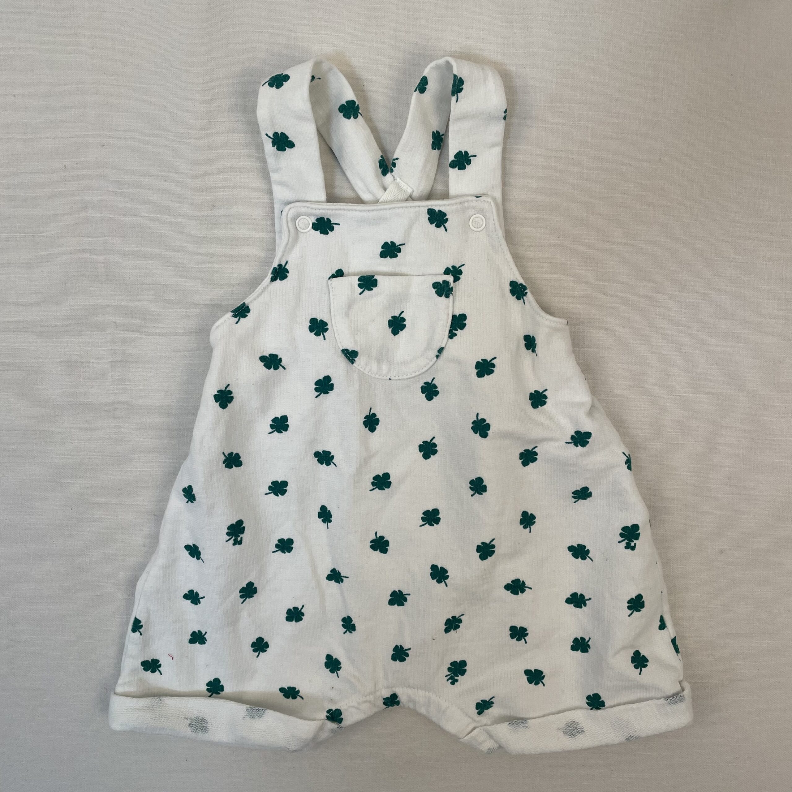 • Salopette courte blanc écru parsemé de feuilles vertes, bretelles croisées réglables par 2 boutons pression, taille semi élastiquée, fermeture à l’entrejambe par boutons pression.