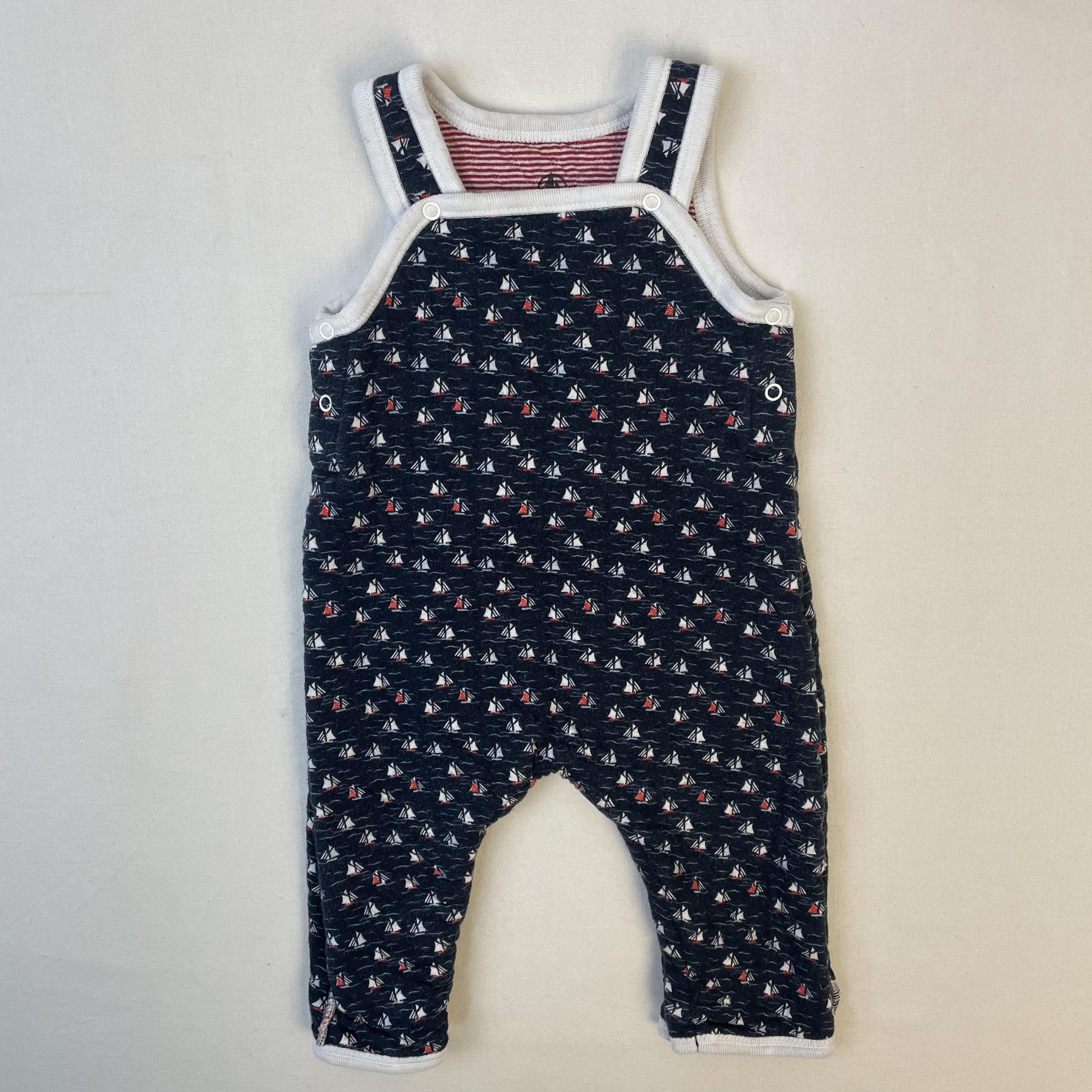 - Salopette en tissu matelassé bleu nuit parsemé de petits bateaux rouges, bleus et blancs, intérieur à rayures rouges et blanches, fermetures des bretelles (non réglables), latérales et à l’entrejambe par boutons pression.