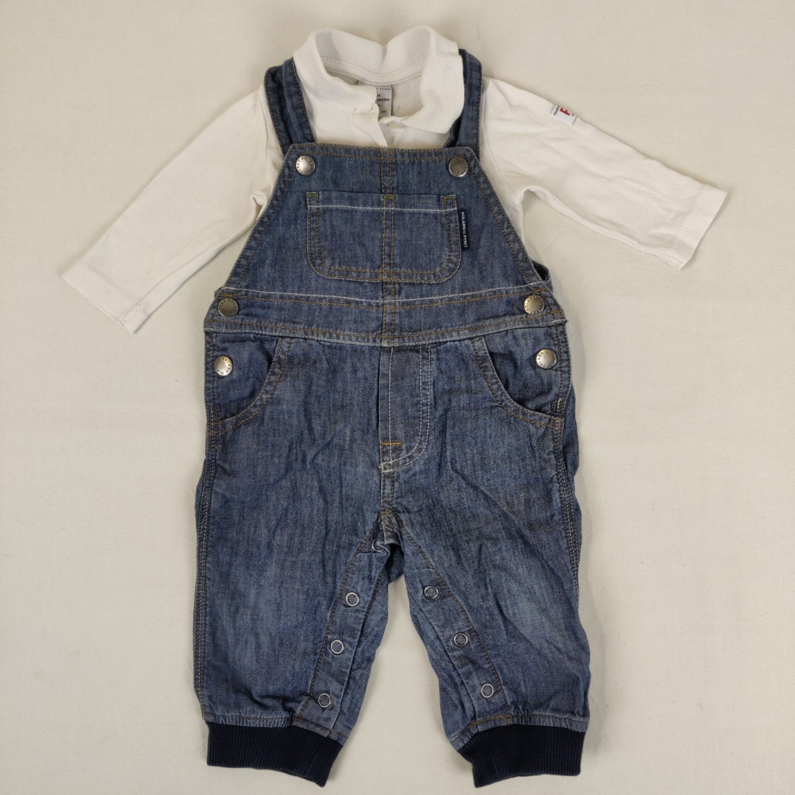 Autres commentaires : Salopette bleue avec fermeture par des boutons pressions et une poche centrale . Polo à manches longues blanc offerte .
