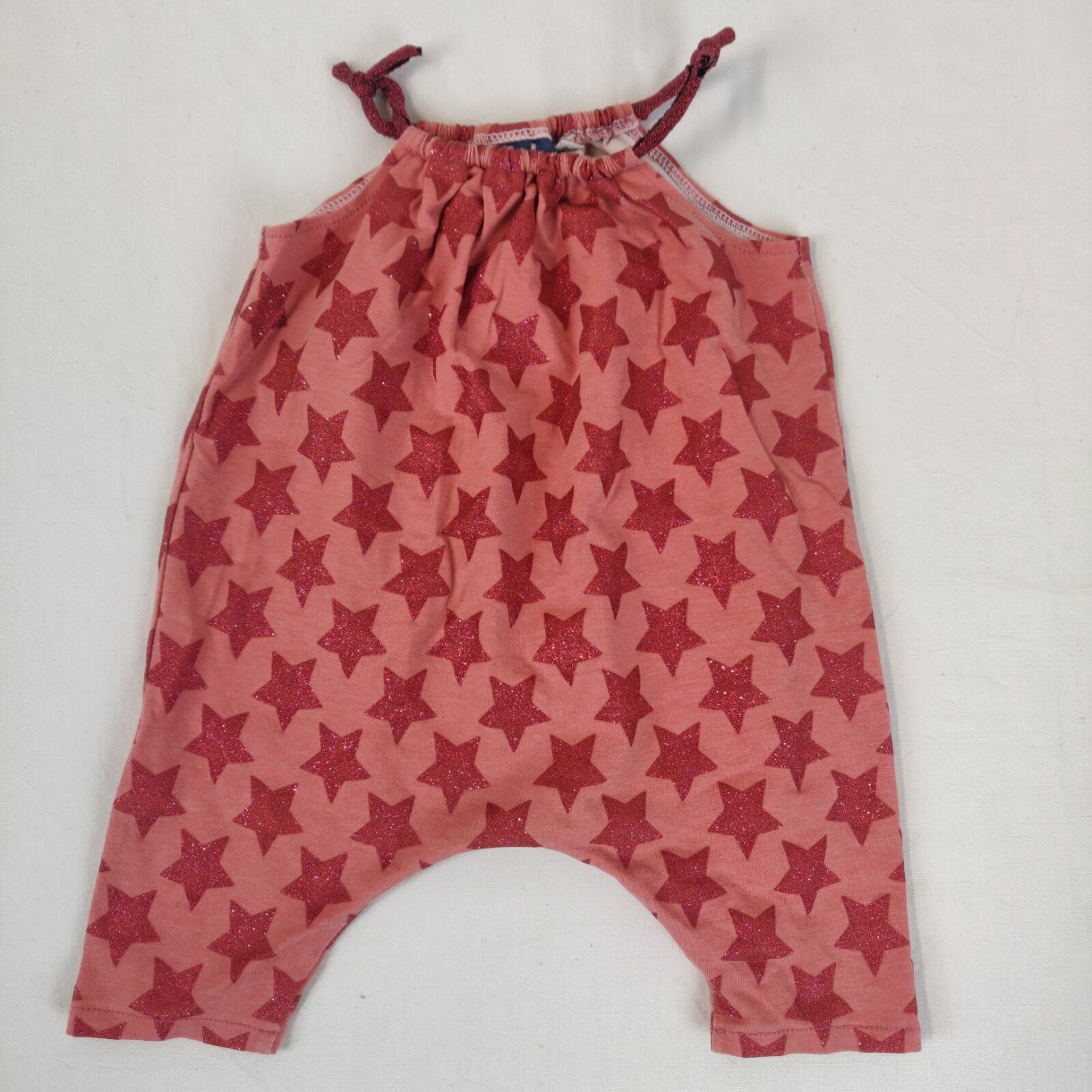 Autres commentaires : 5% élasthanne. Salopette à fines bretelles – rose avec des motifs etoiles roses pailletées.