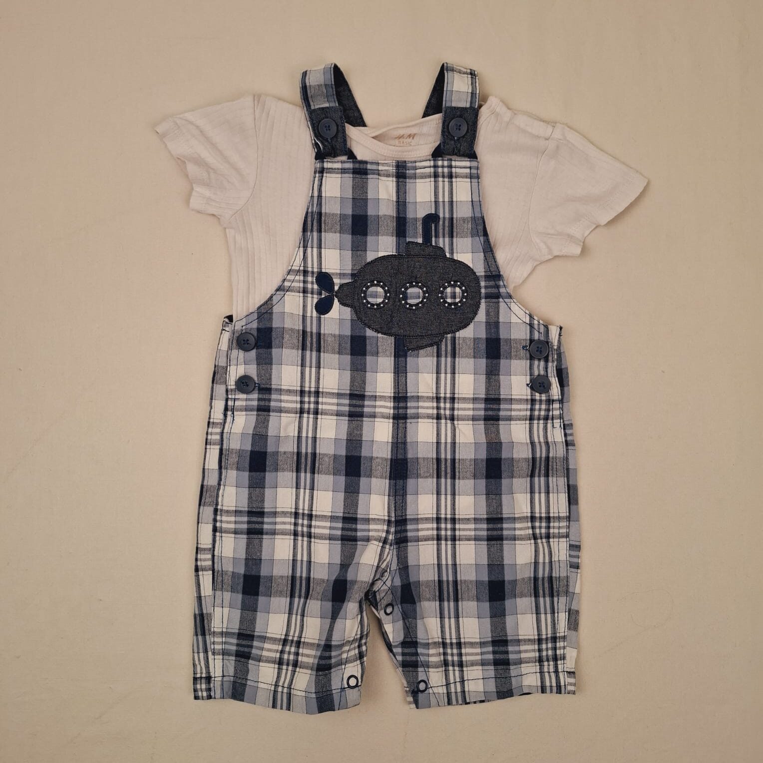 Autres commentaires : Salopette courte à carreaux blancs et bleus, fermeture des bretelles par bouton, devant motif de sous-marin bleu gris, fermeture à l’entrejambe par boutons pression. OFFERT : Body blanc côtelé H&M manches courtes, en coton bio, traces devant.