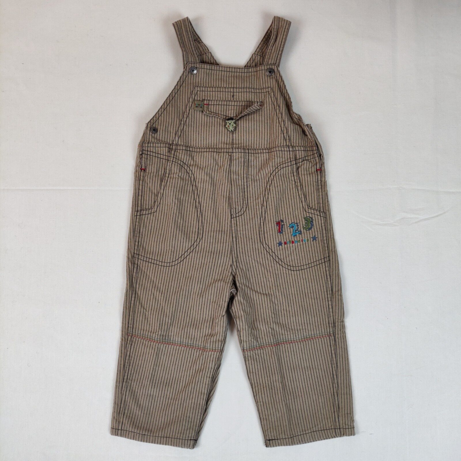 Autres commentaires : Salopette doublée – marron avec de fines rayures verticales bleu marine. Bretelles réglables à 2 boutons pression. Motifs chiffres 1,2,3 rouge, vert et bleu à la poche gauche. Ouvertures latérales à un bouton pression. Ouverture à l’entrejambe à boutons pression. 2 poches latérales et 2 poches arrières.