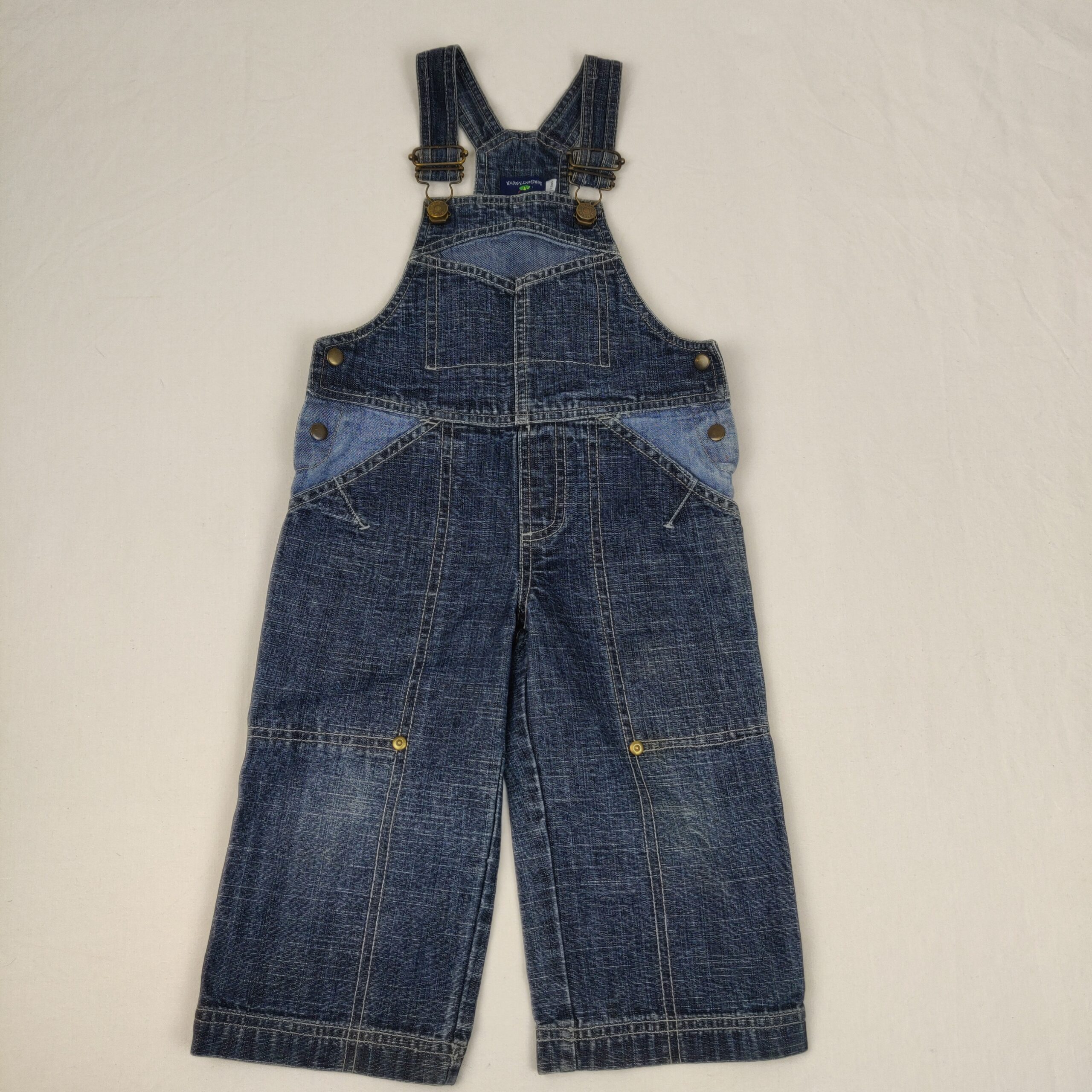 Autres commentaires : Salopette en jeans denim foncé avec empiècements bleu clair – bretelles réglables avec attaches et boutons metalliques – ouverture sur chaque côté par deux boutons pression – larges poches