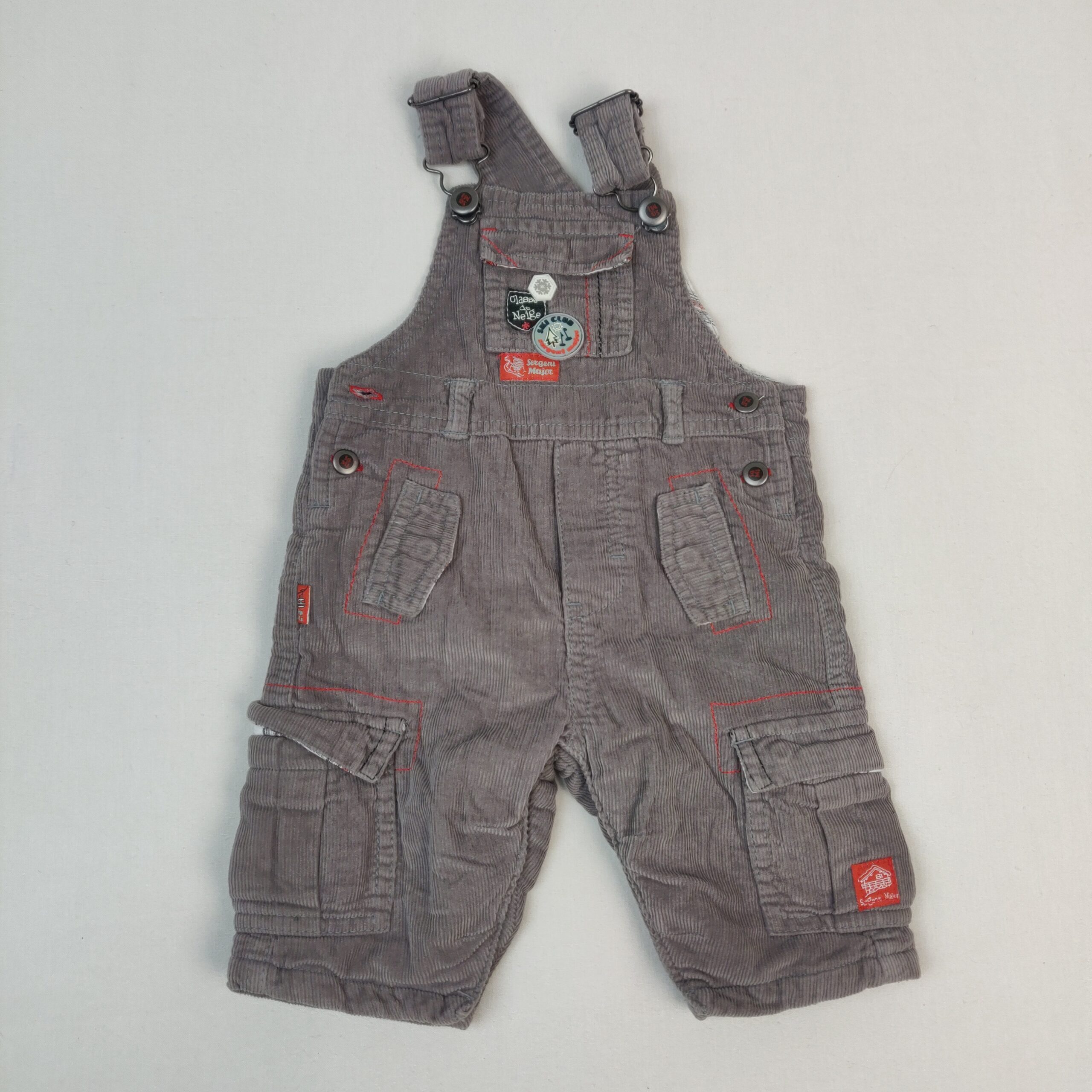 Autres commentaires : Salopette grise en velours côtelé, doublée en haut avec un tissu à carreaux blancs, noirs et rouges et en polaire orange 100% polyester au niveau du bas, bretelles à boucles réglables, fermeture latérales et à l’entrejambe par boutons pression.