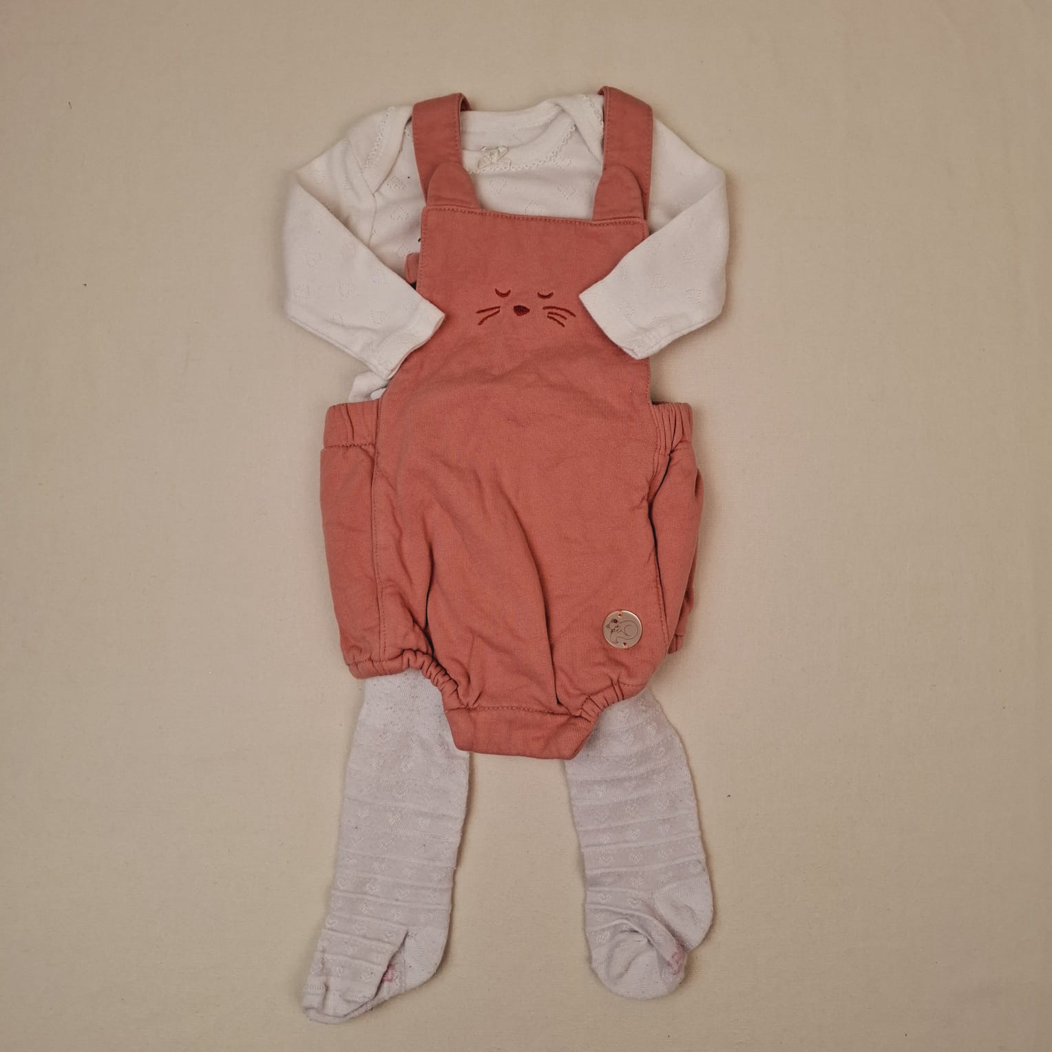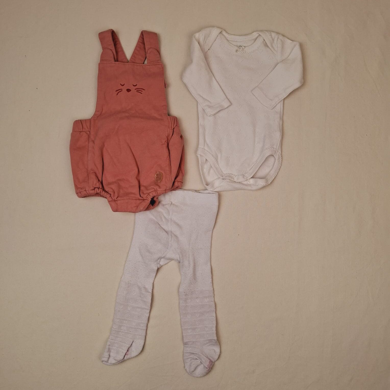Autres commentaires : Ensemble 3 pièces : – Salopette rose poudrée, bretelles croisées et ajustables par 2 boutons pression, taille élastiquée au dos, cuisses élastiquées, fermeture par boutons pression à l’entrejambe , motif chat, doublure en coton. – Collants blanc. – Body TEX blanc à manches longues, col US, 100% coton.