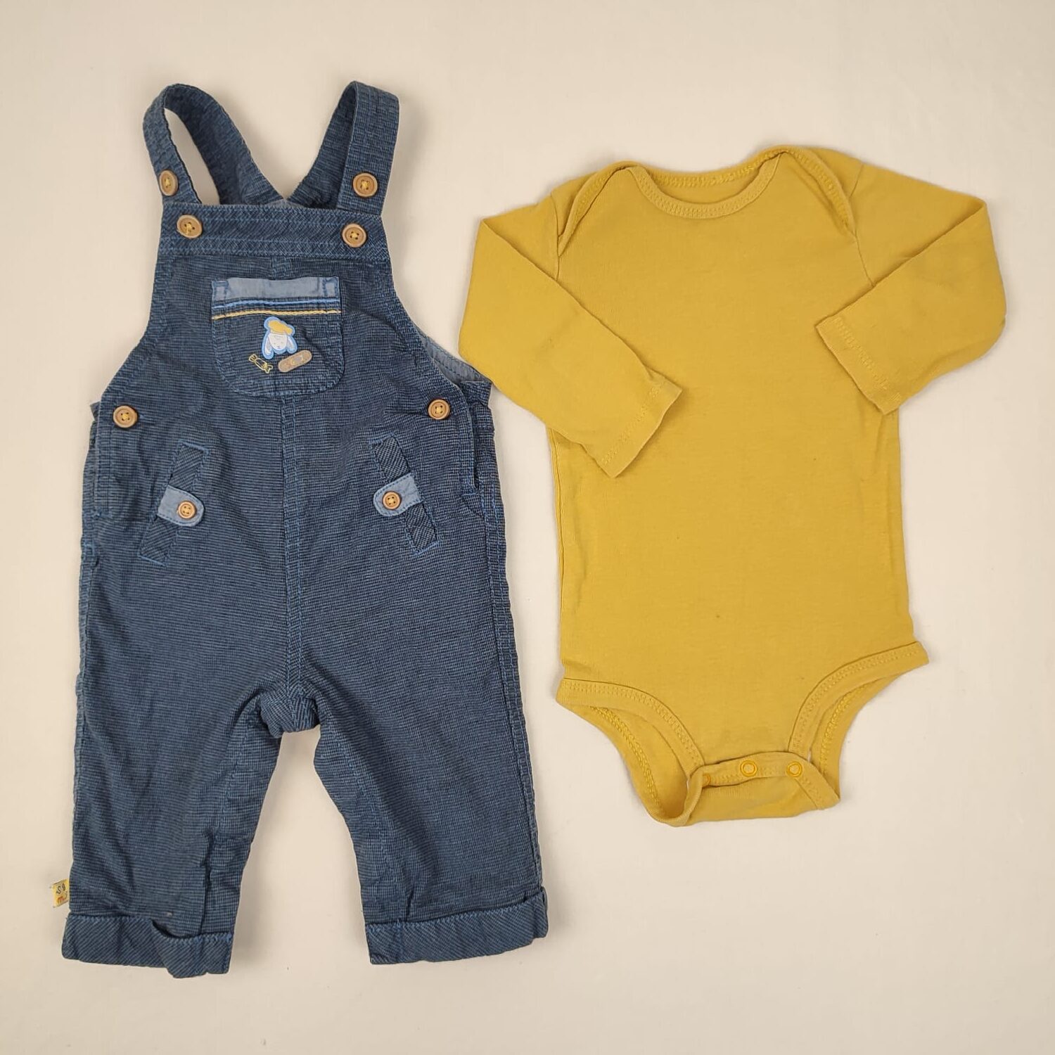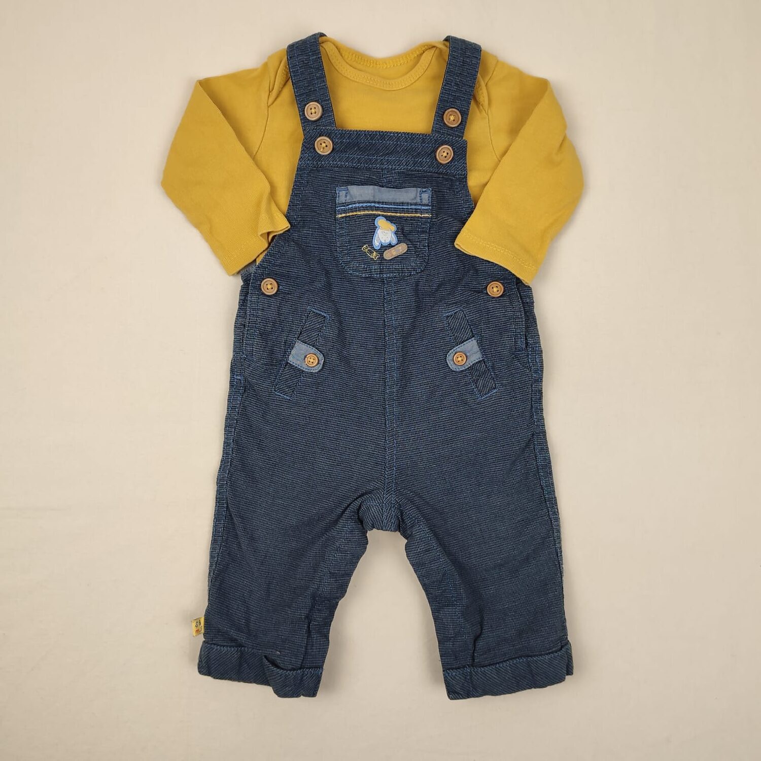Autres commentaires : Ensemble 2 pièces : – Salopette doublée bleu foncé, hauteur des bretelles réglables par 2 boutons, fermeture latérale par boutons et à l’entrejambe par boutons pression, 3% élasthanne, doublure 41% polyester. – OFFERT : Body jaune uni à manches longues.