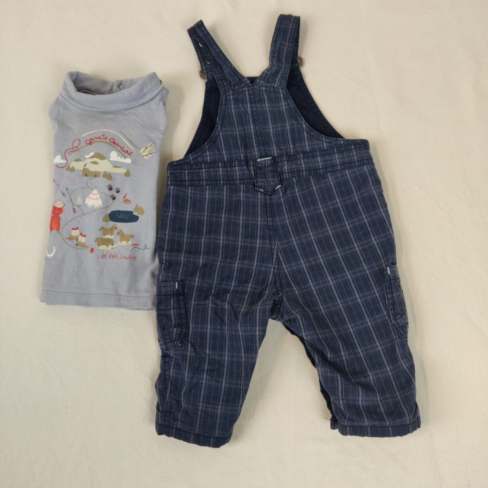Autres commentaires : Salopette légèrement doublée – bleu-gris à motifs carreaux gris clairs. Bretelles réglables à l’aide de pressions. Une pochette centrale ornée d’un chateau. 4 poches latérales. Un t-shirt à manches longues et col roulé bleu-gris offert. Un léger trou au devant.
