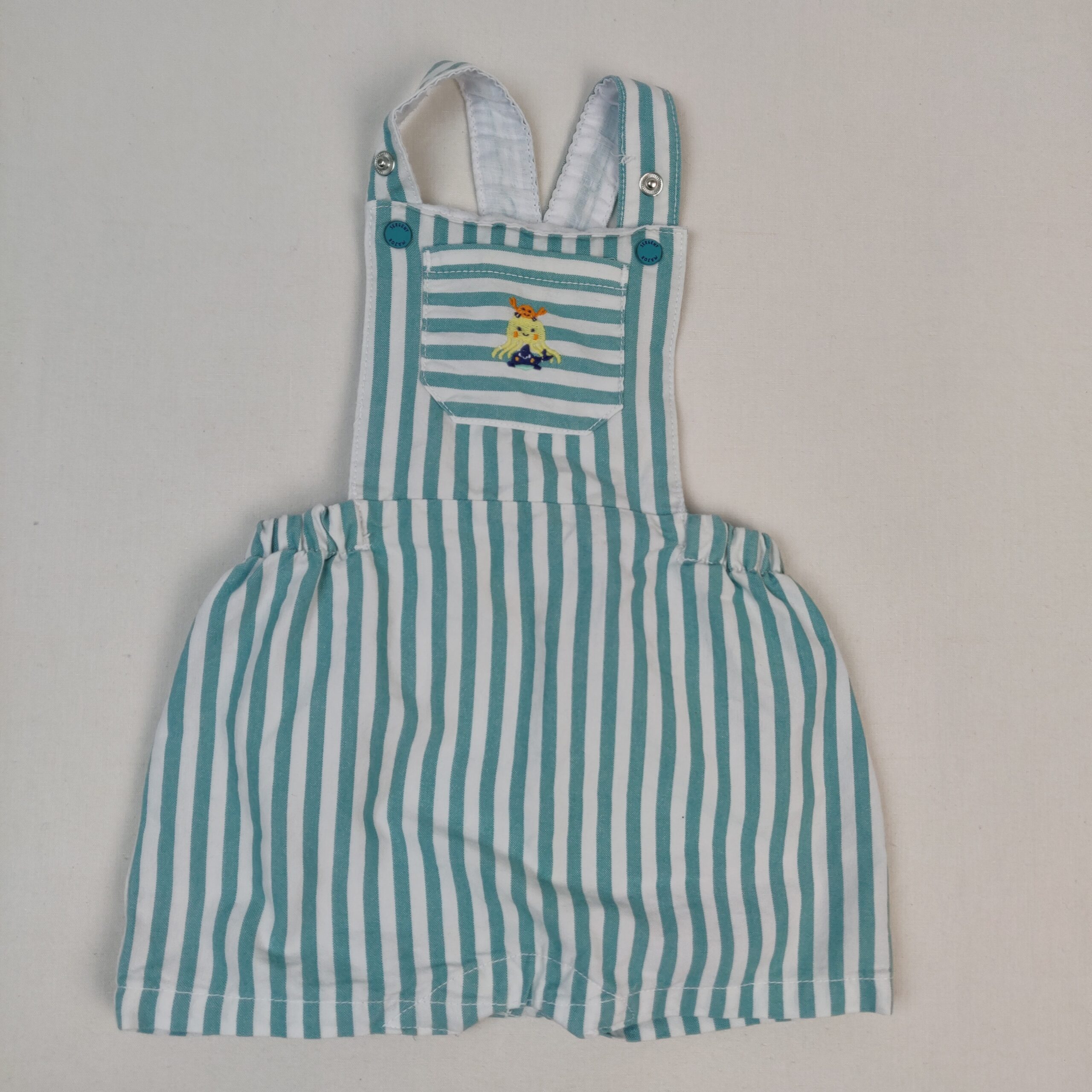 Autres commentaires : Salopette très courte à rayures verticales blanches et vert d’eau, dos-nu, poche devant avec motif petits crabe orange, pieuvre jaune et poisson bleu, bretelles crosiées réglables par boutons pression, taille élastiquée et fermeture par boutons pression à l’entrejambe.