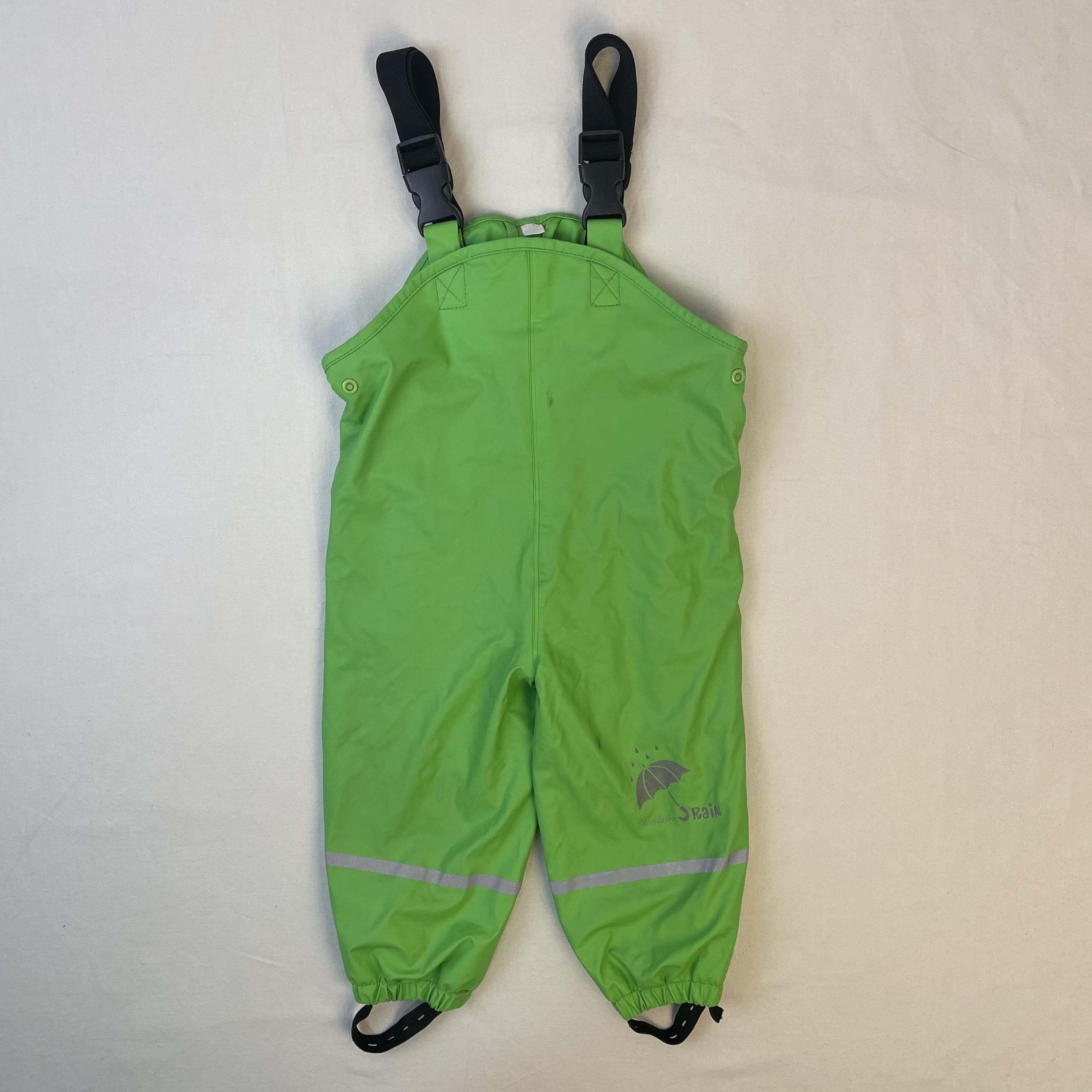 - Salopette de pluie verte, avec bandes réfléchissantes, chaude doublée, ajustable par boutons pression latéraux, chevilles élastiquées, élastiques pour les pieds, bretelles noires réglables avec fermeture par clips plastique. 2 petites traces grises.