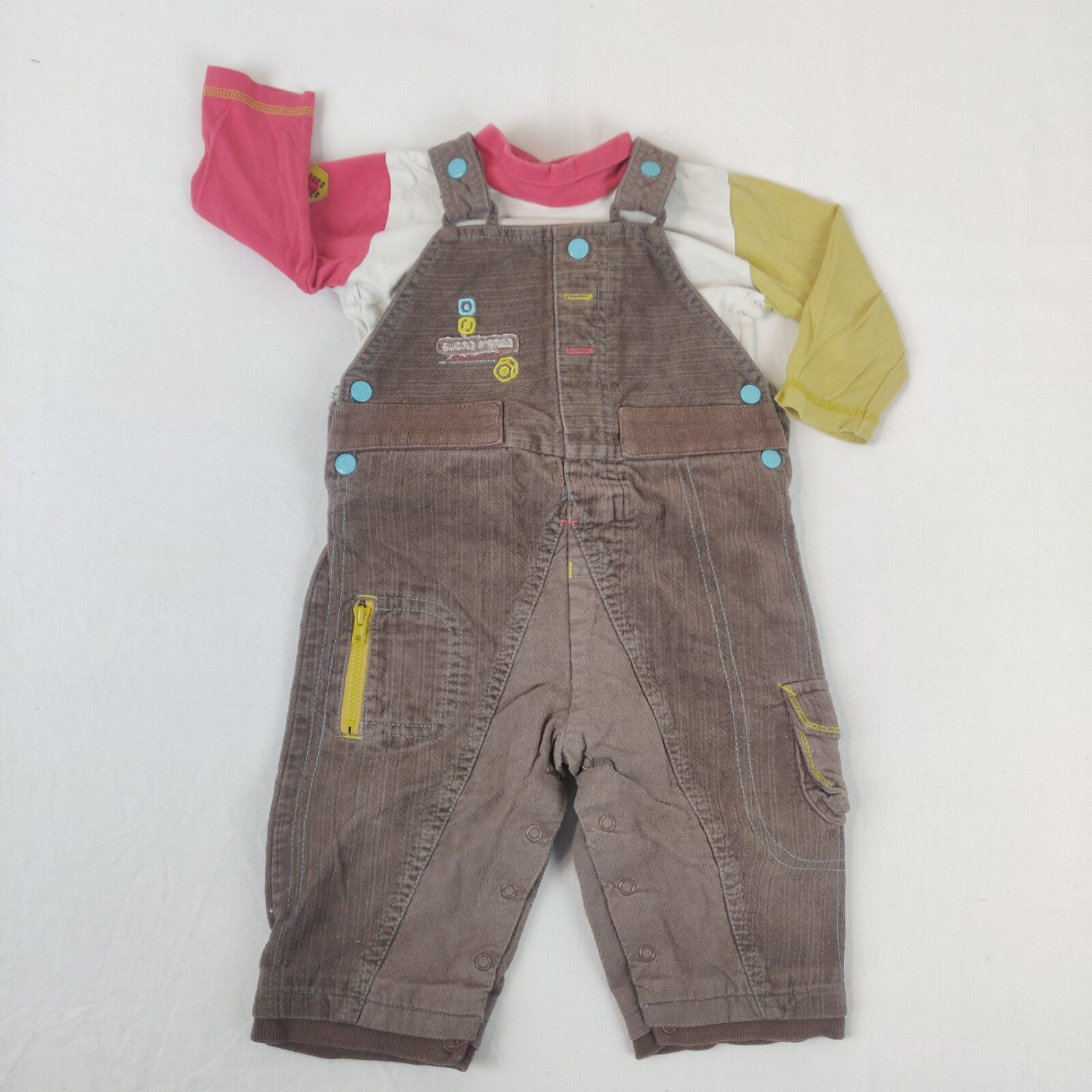 Autres commentaires : Salopette en velours marron. Bretelles réglables à l’aide de pressions. Une poche latérale zippée et une poche latérale à rabat. Griffe de la marque centrale. Une poche arrière en trompe-l’oeil. Ouverture à l’entrejambe à pressions. Un t-shirt à manches longues Sucre d’Orge – blanc, rouge et vert offert. Tâche centrale.