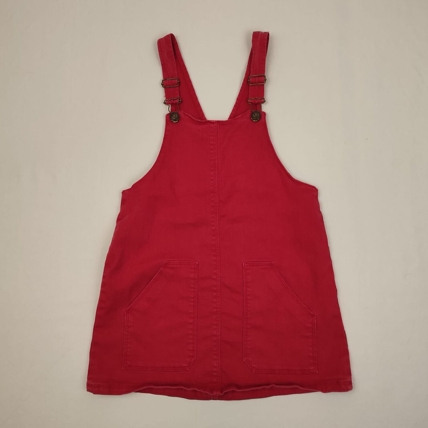 Autres commentaires : 2% élasthanne – Robe salopette en denim rouge, bretelles à boucles réglables, grandes poches latérales.