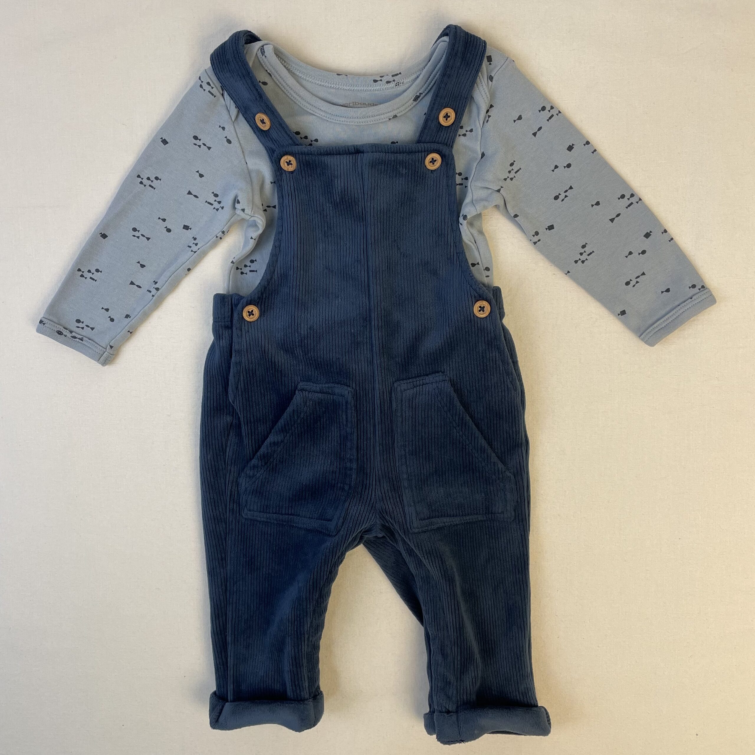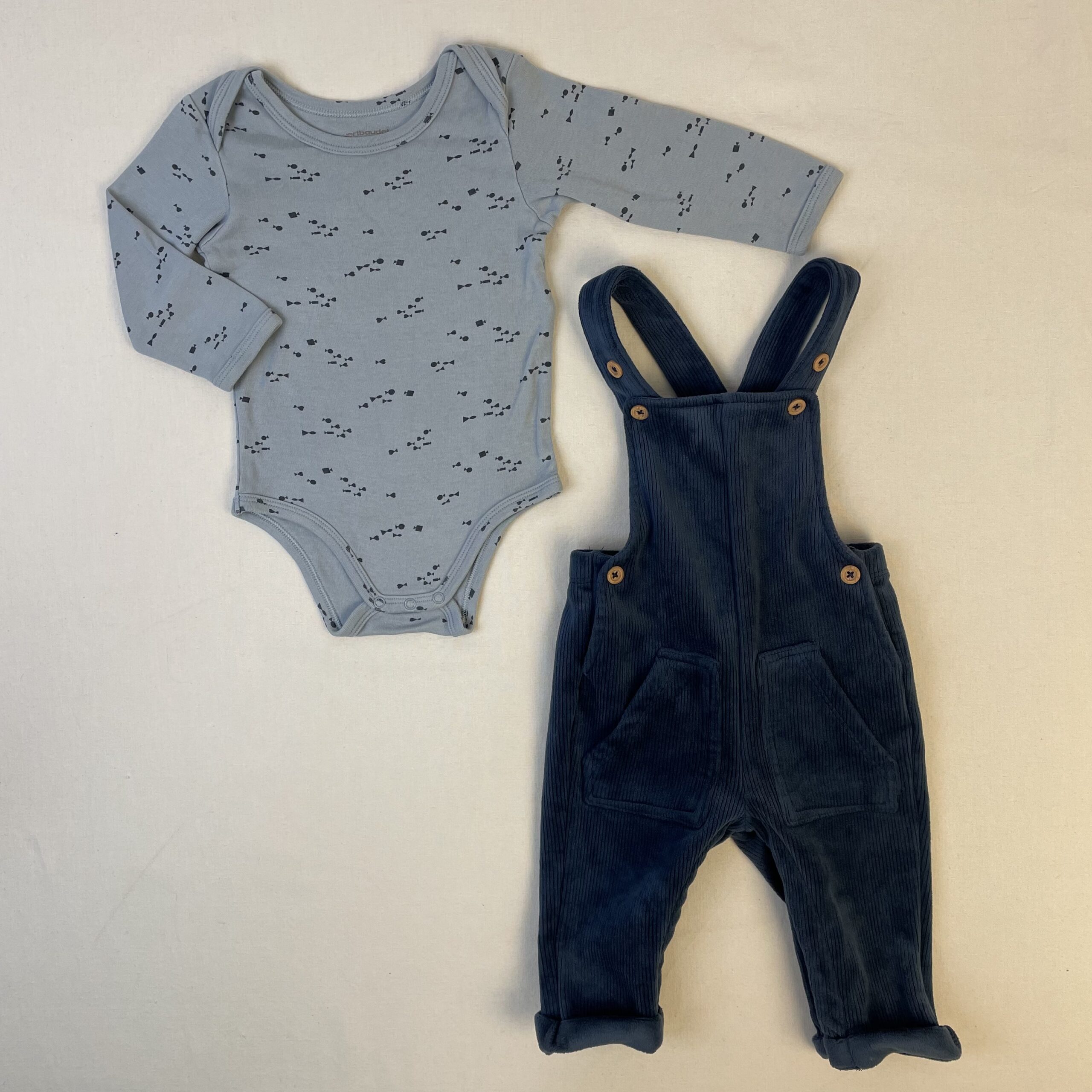 - Salopette bleu foncé côtelée, doublure en velours tout doux . OFFERT body à manches longues Vertbaudet bleu clair parsemé de petits poissons.
