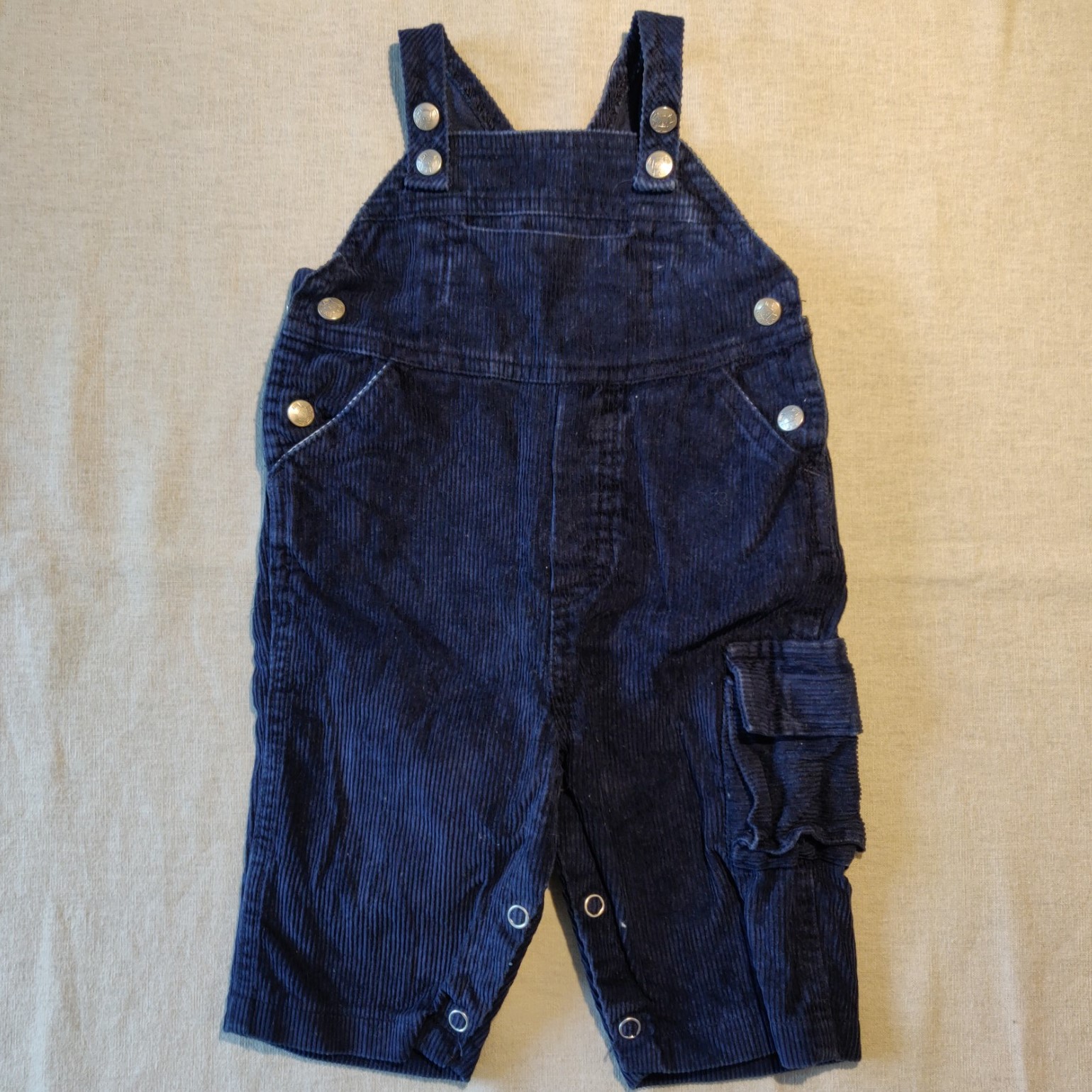 Autres commentaires : Salopette en velours côtelé bleu marine, non doublée. Fermeture à l’entrejambe par boutons pression, sur les côtés et aux épaules par des boutons à deux hauteurs pour régler la stature. 4 poches, une centrale, deux latérales et une sur la jambe gauche.