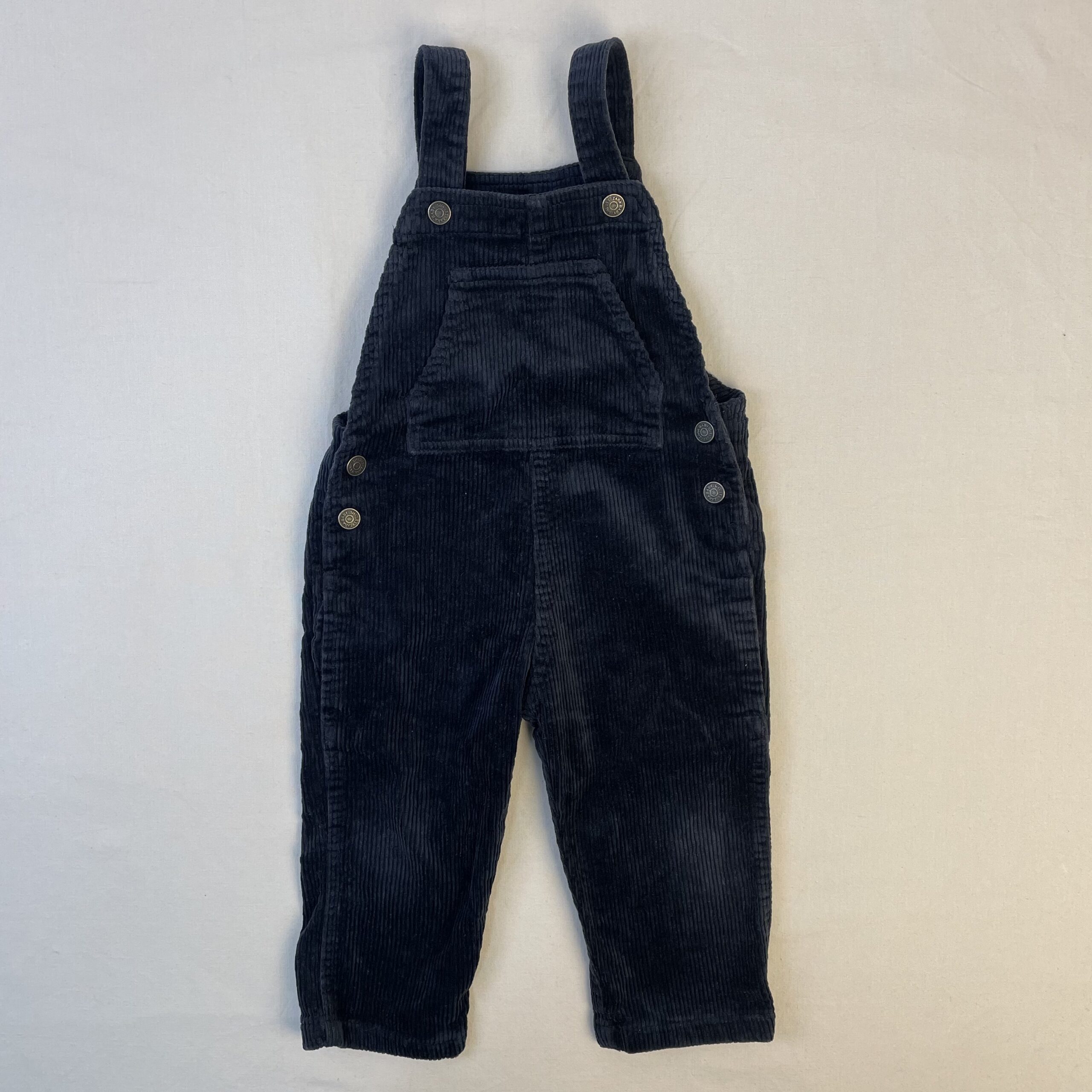 - Salopette en velours côtelé bleu nuit, hauteur des bretelles réglables par boutons pression, fermeture latérale par boutons pression.