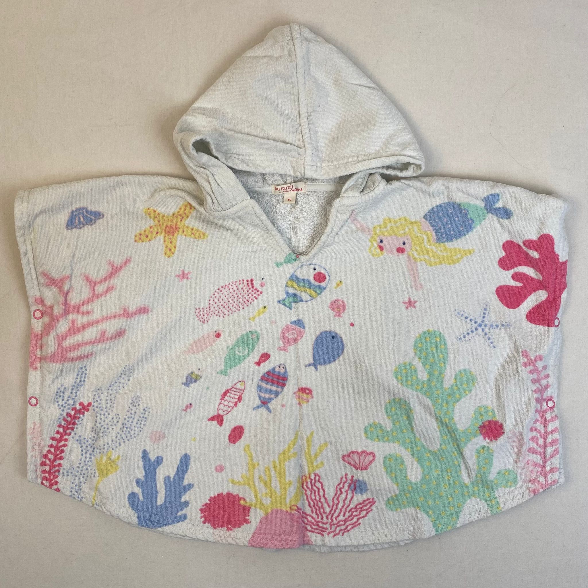 Poncho de bain en éponge, blanc parsemé devant de motifs mulicolores de poissons, étoiles de mer, algues et sirène, fermetures latérales par boutons pression.