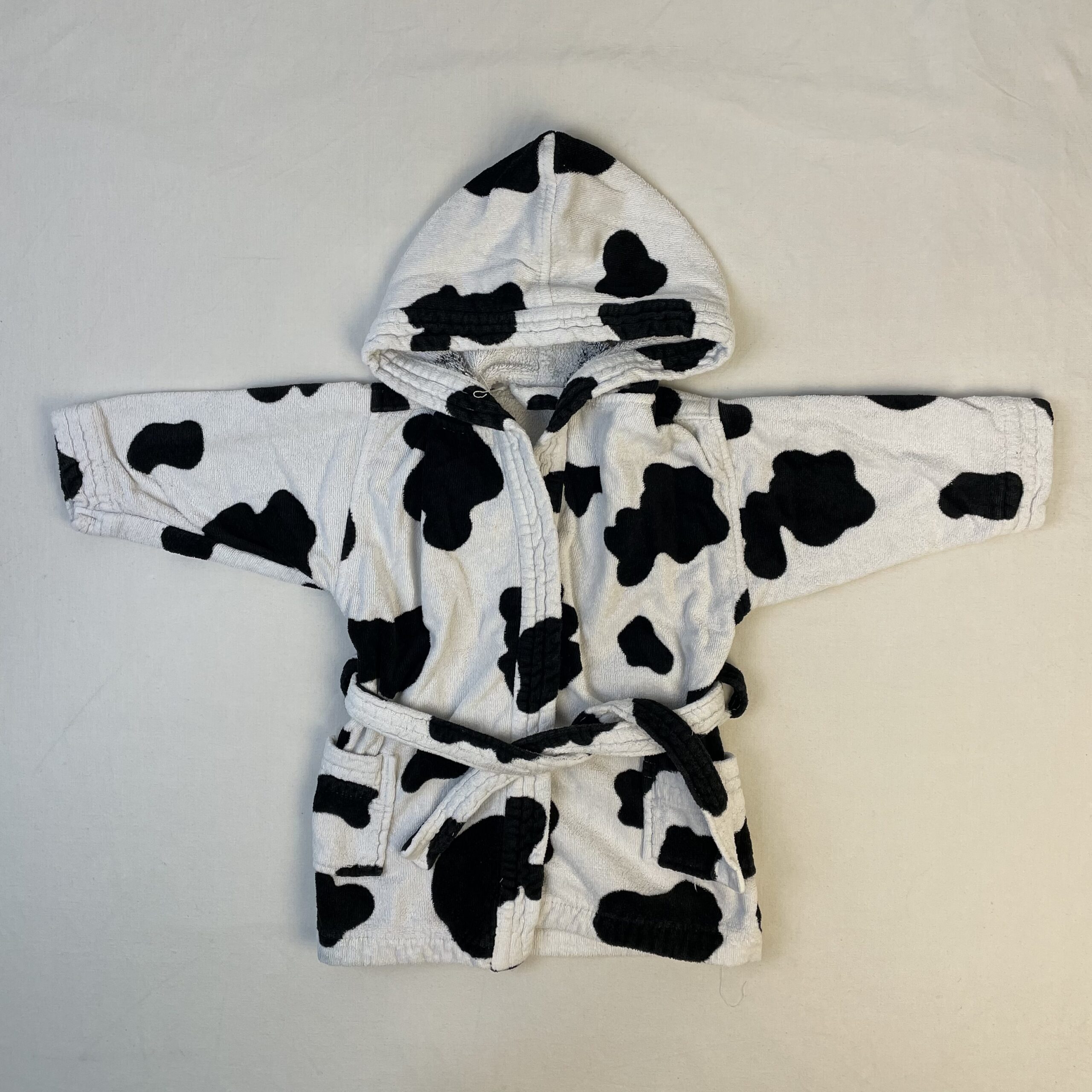 - Peignoir de bain noire et blanc en velours à capuche avec ceinture, environ 2 ans, petits taches.