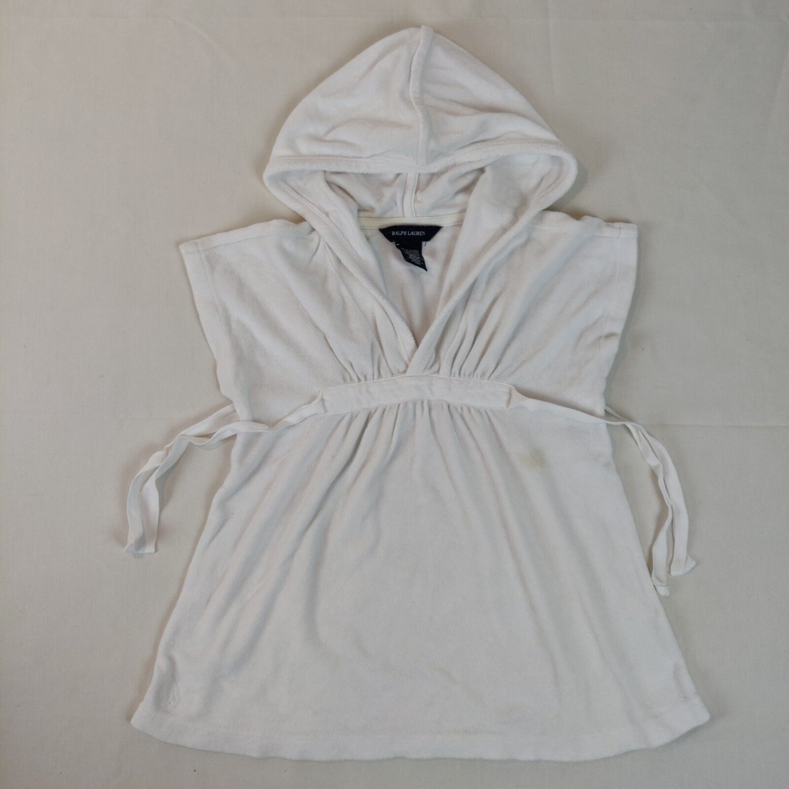 Autres commentaires : 10% polyester. Peignoir sans manche et à capuche en éponge – blanc. Ceinture blanche. Peti défaut : tâche jaune de 3 cm de diamètre – niveau réduit de Kiwi à Fraise