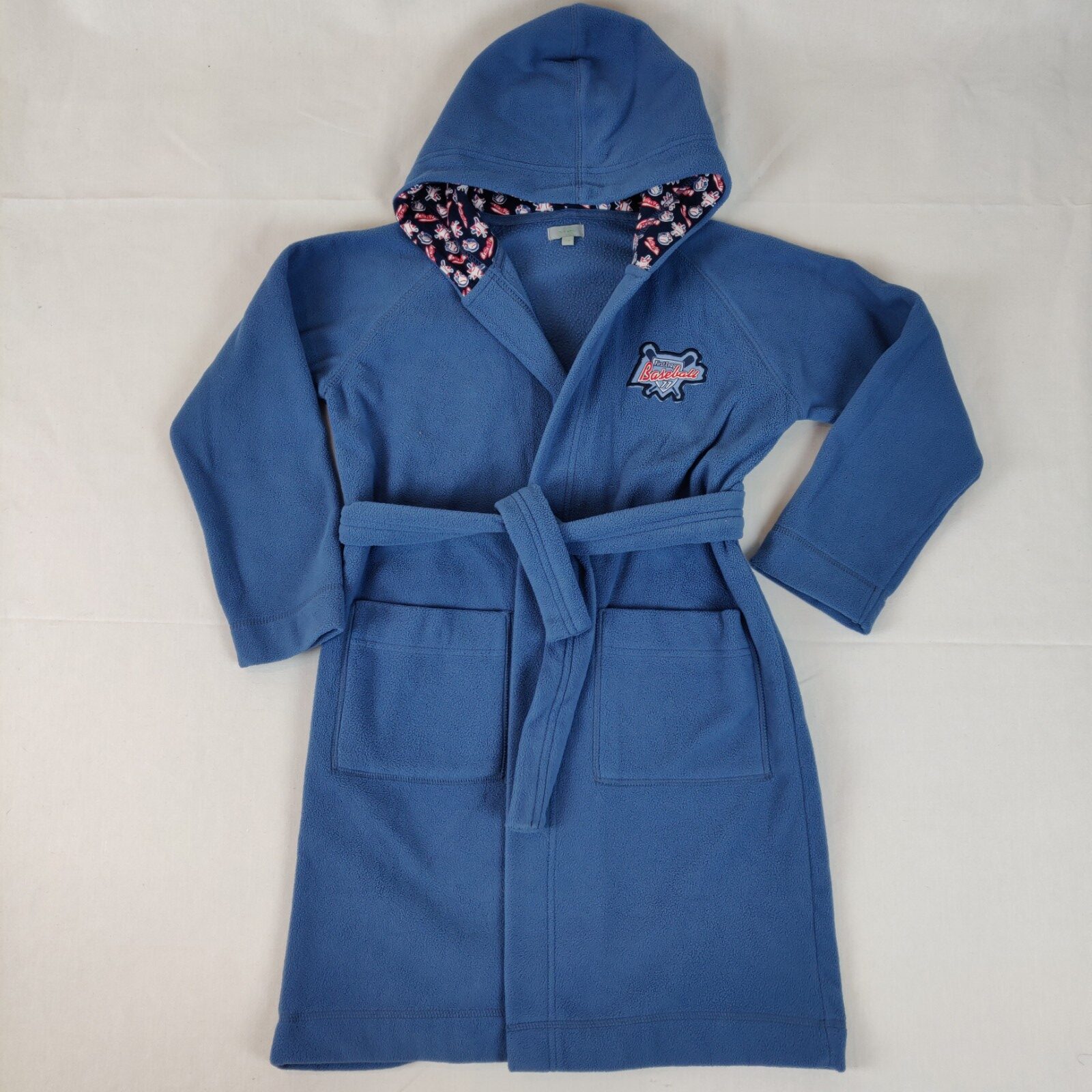 Autres commentaires : Robe de chambre à capuche en polaire – bleu avec ècusson central « First league Baseball 77 ». 2 poches latérales et une ceinture assortie.