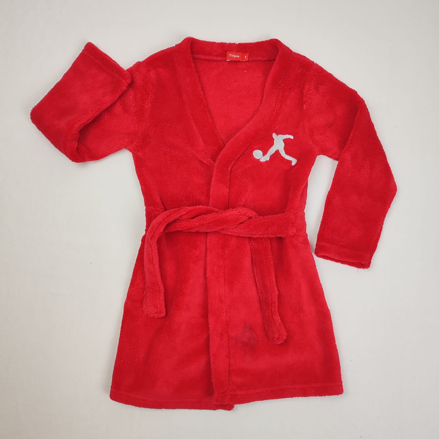 Autres commentaires : Robe de chambre rouge en polaire toute douce, style peignoir croisé avec ceinture non détachable à nouer, taille élastiquée, motif silhouette grise de footballeur au niveau de la poitrine.