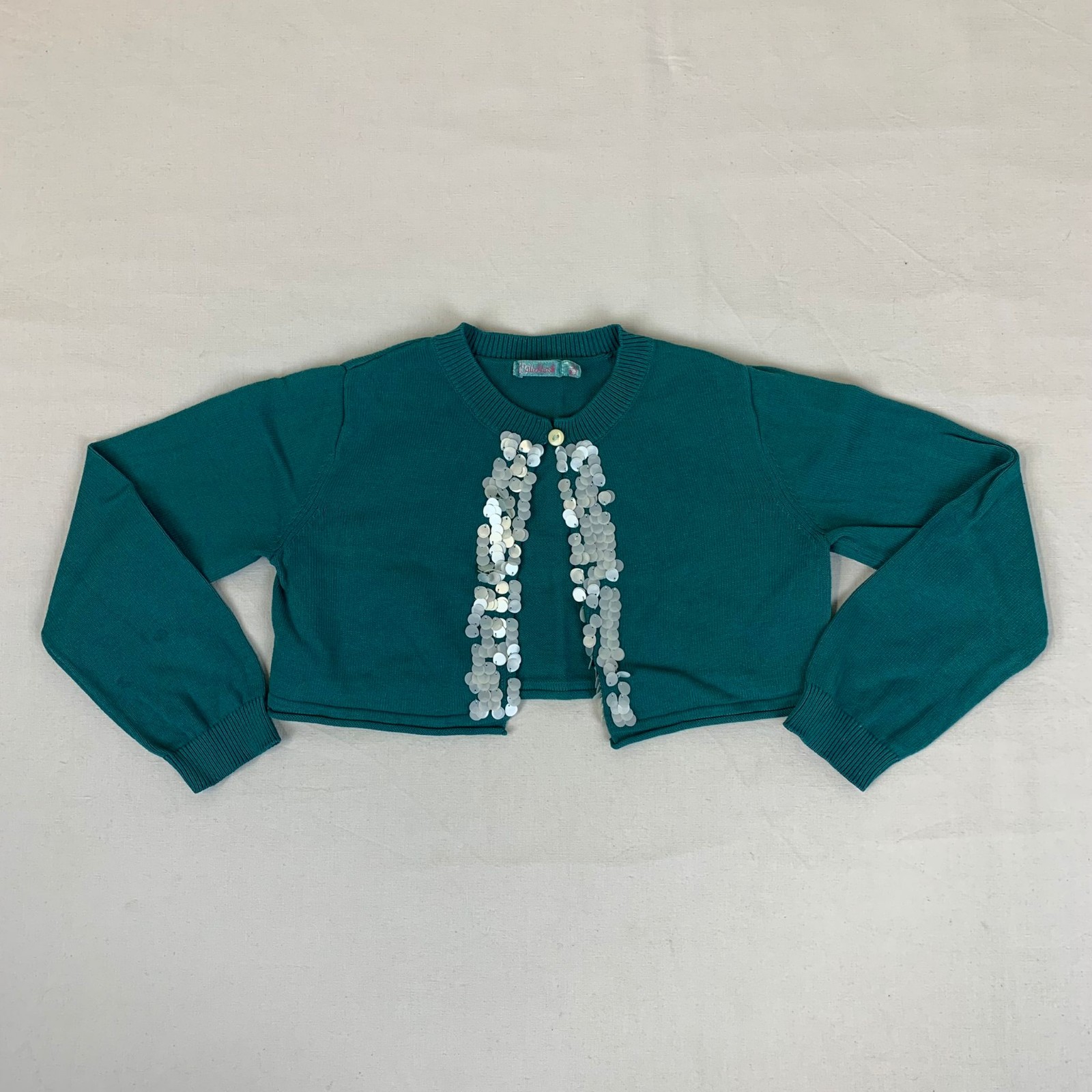 Autres commentaires : Boléro court vert menthe manches longues et des paillettes avec une fermeture par bouton en haut.
