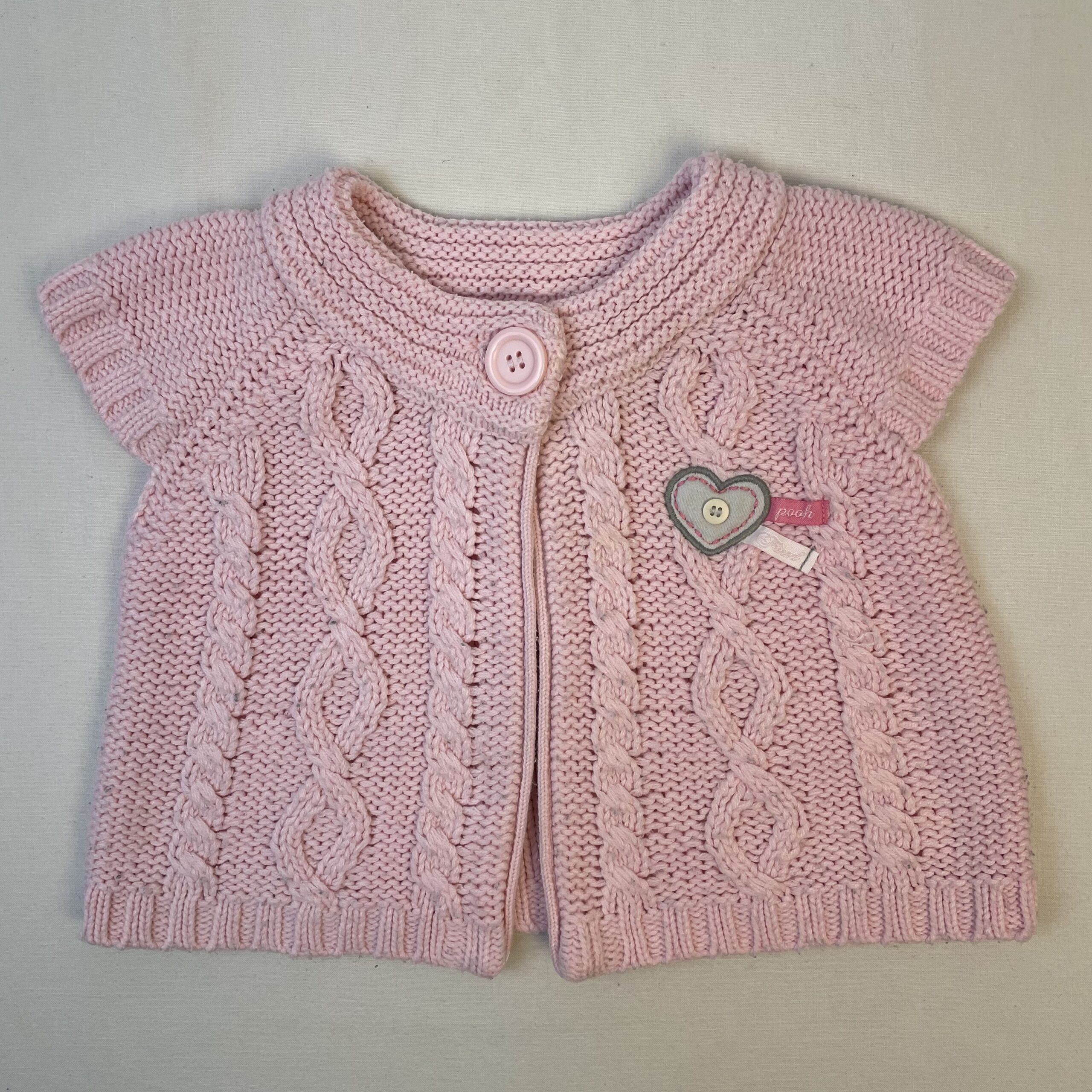 - Boléro tricoté rose clair, manches courtes, fermeture par bouton classique, motif coeur, bouloches et tache pâle devant.