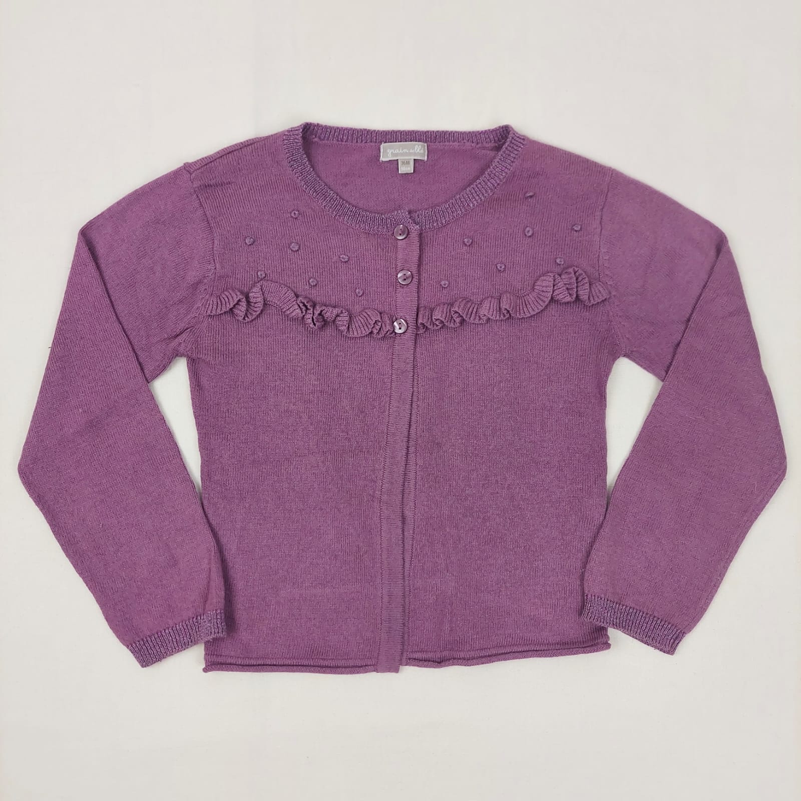 Autres commentaires : 33% viscose, 21% coton, 6% angora, 1% polyester, 1% fibre métalique, Boléro violet, col et manchette brillants