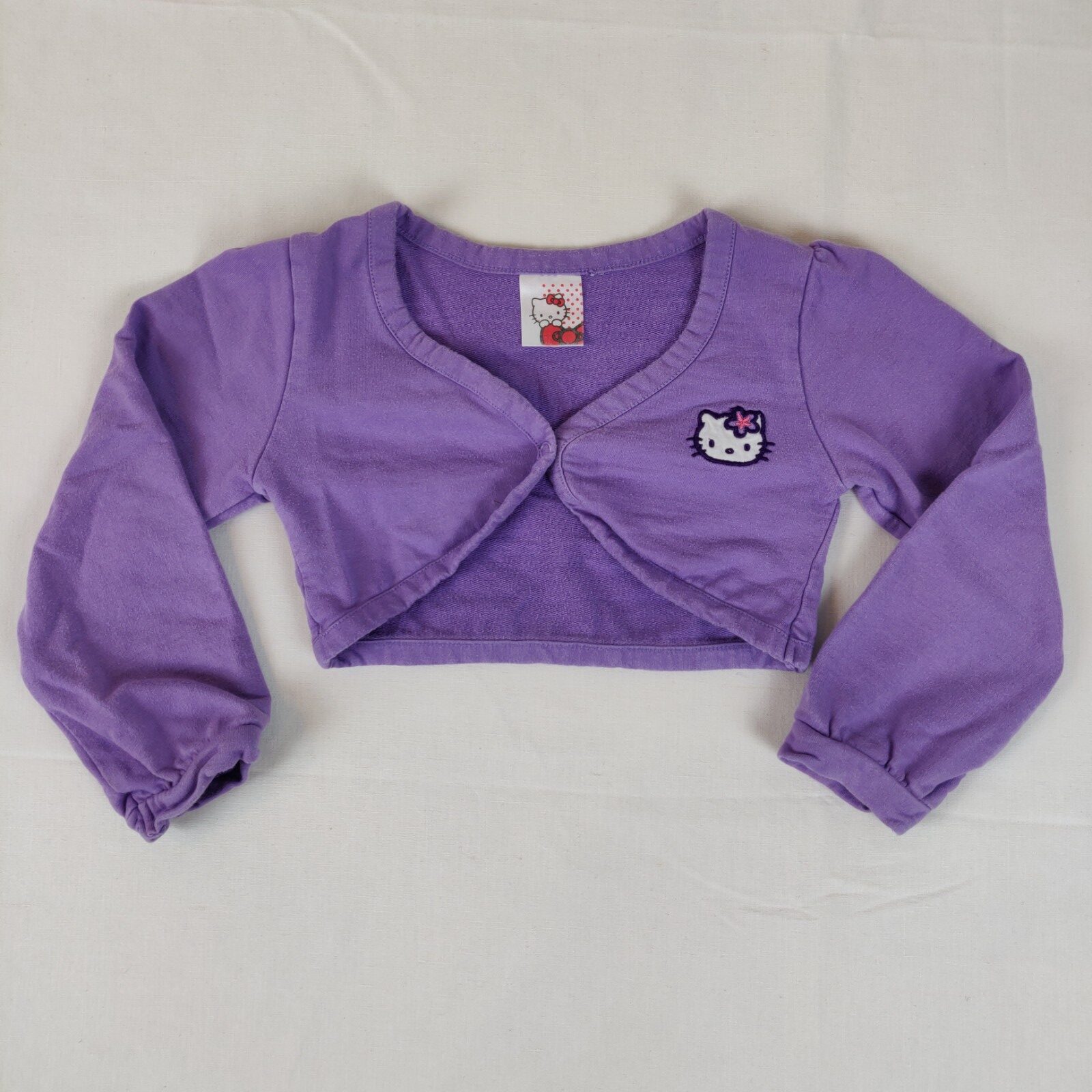 Autres commentaires : Boléro uni violet, taille estimée 4A. Tête de Hello Kitty brodée au coeur.