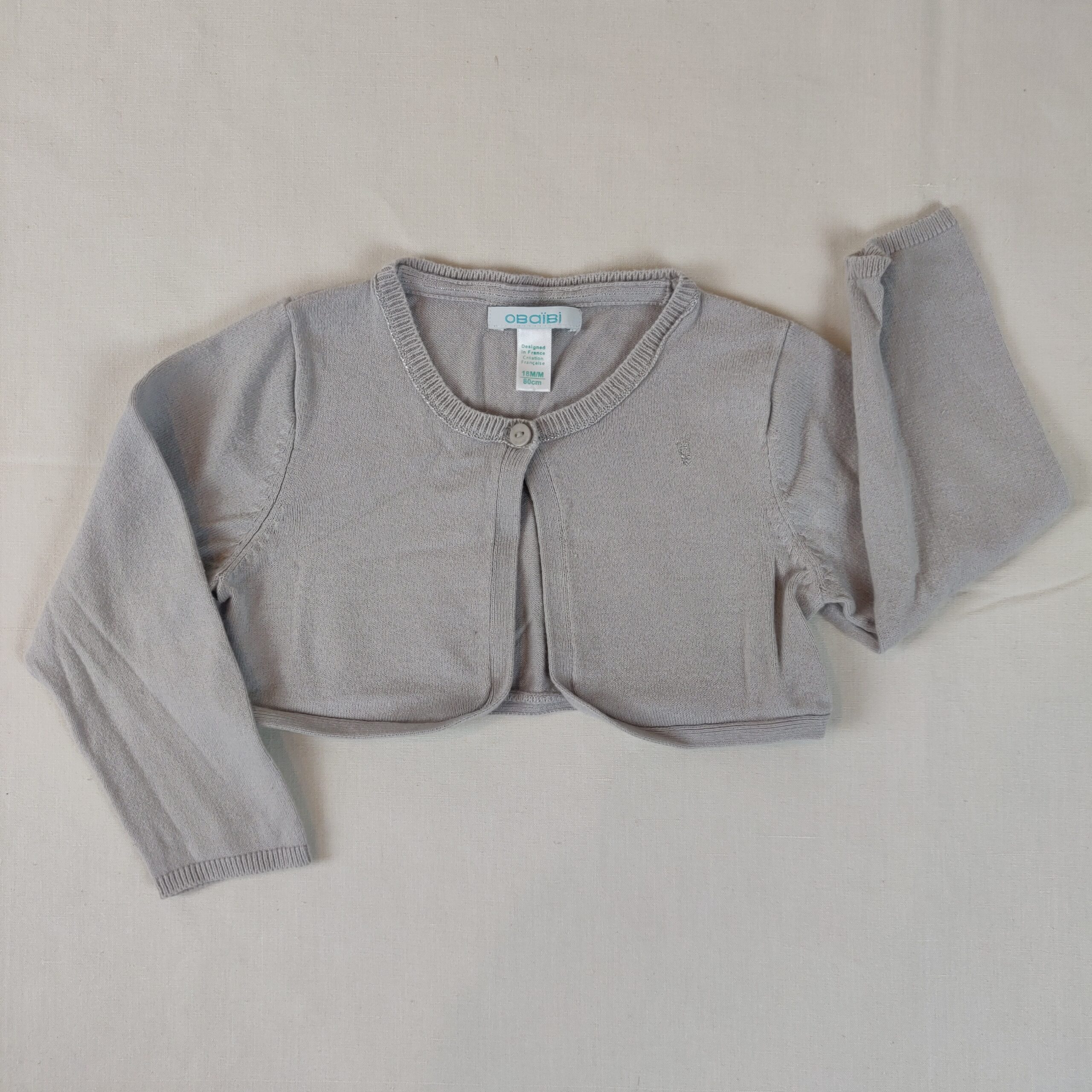 Autres commentaires : Boléro – taupe – ouverture à un bouton au col. Liseré en fil argenté au col.