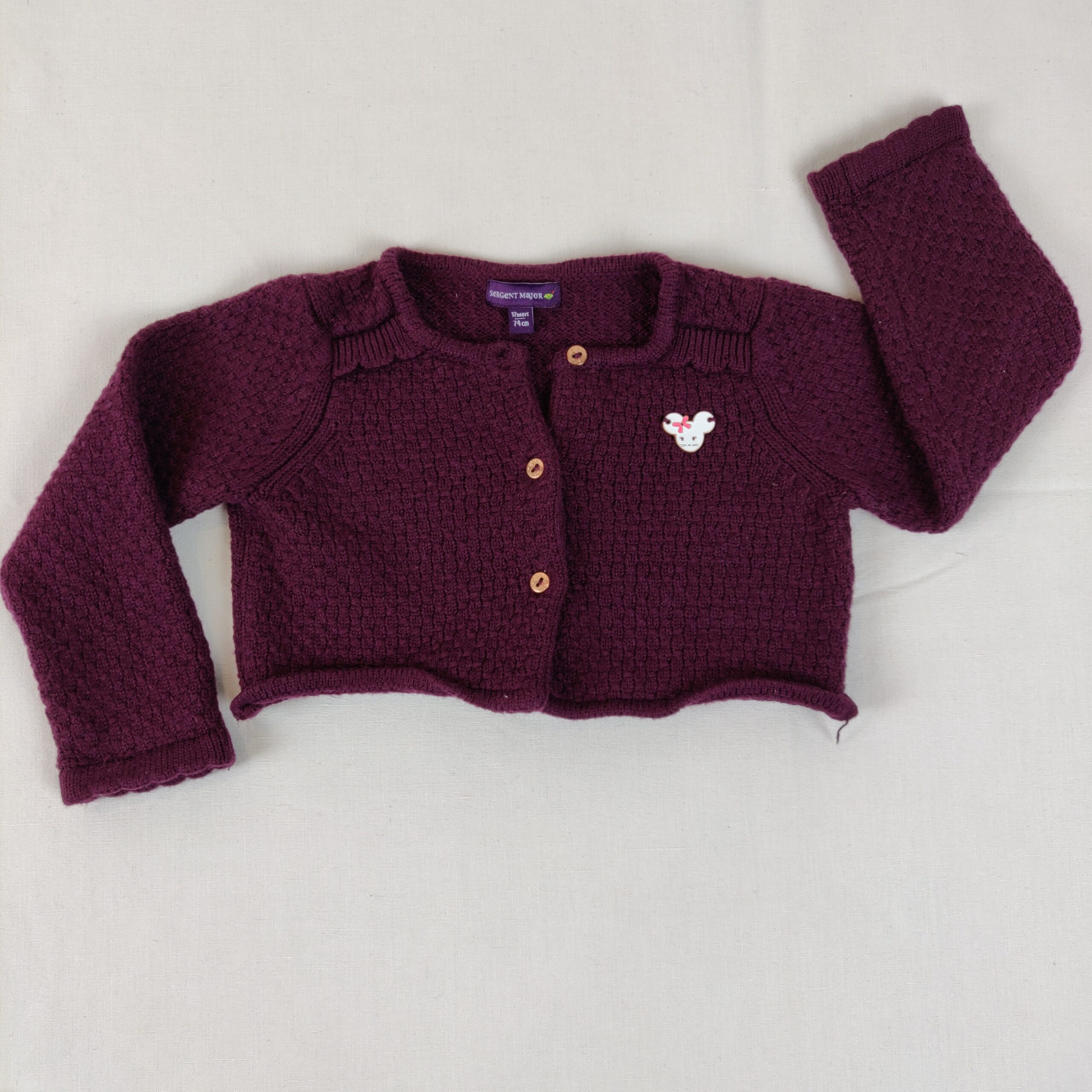 Autres commentaires : 31% polyamide, 25% coton, 8% laine. Boléro en maille – prune – ouverture centrale à 3 boutons classiques cuivrés. Ecusson métallique cousu petite souris blanche.