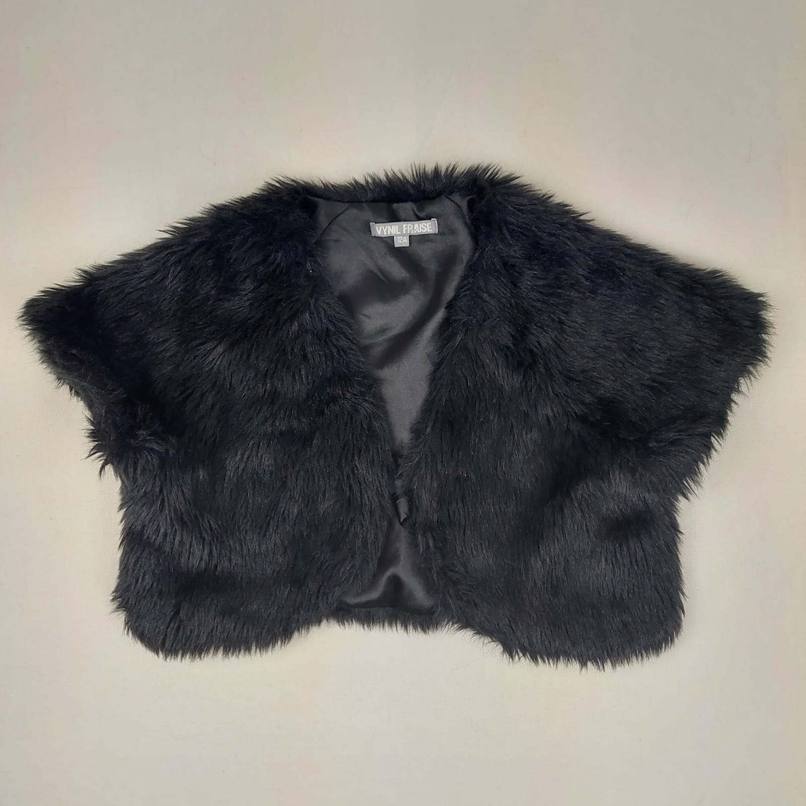 Autres commentaires : Boléro manches courtes en imitation fourrure noire, fermé par un bouton et un lacet ; extérieur 80% acrylique, doublure polyester.