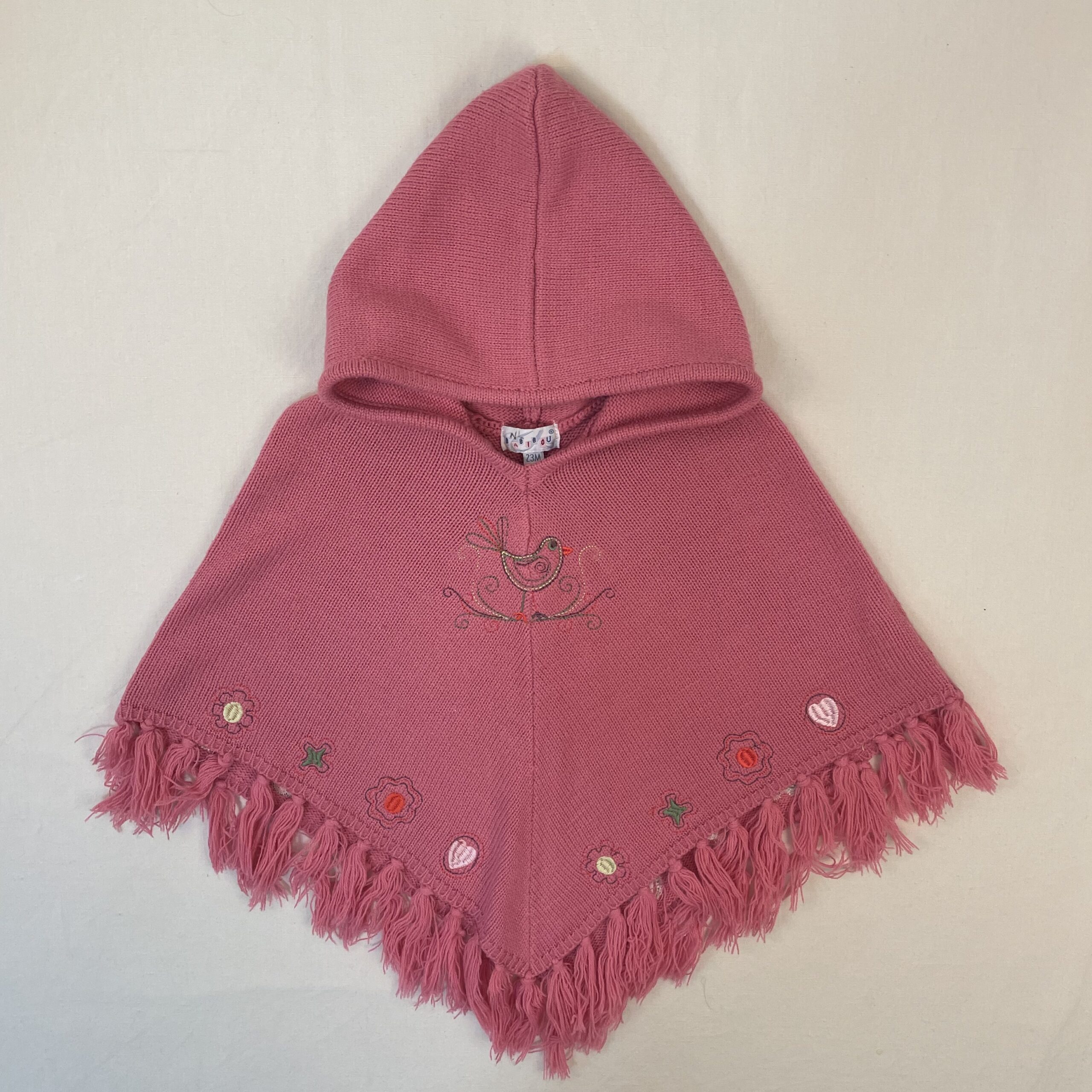 - Poncho en tricot rose bonbon avec capuche, devant motif oiseau coloré brodé, frises d’éléments brodés colorés, frangé en bas.